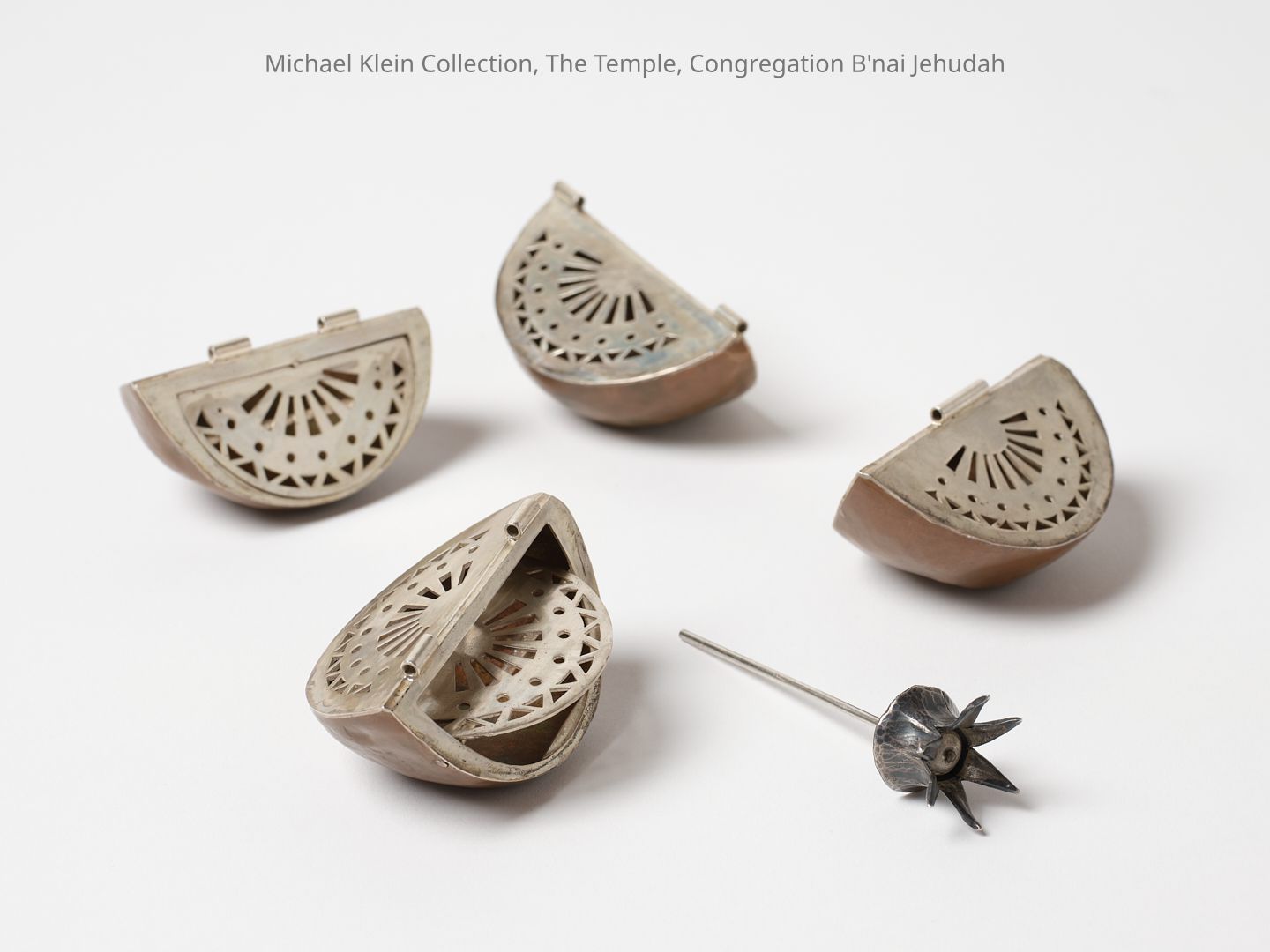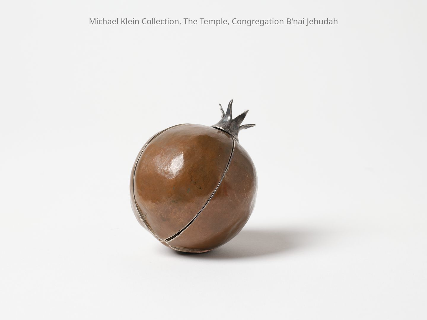 Runner Up, 1998 Philip and Sylvia Spertus Judaica Prize. The artist's commentary from the 1998 catalogue: "It is said that the many-chambered pomegranate contains 613 seeds, corresponding to the 613 mitzvot. The previous Lubavitcher Rebbe said that every Jew "...is filled with mitzvot as every pomegranate is filled with seeds." My spice container contains segments of this fruit, which can be distributed to several persons, allowing them to enjoy the perfume of Havdalah simultaneously. The outer pomegranate form of my segmental spice container is made of hand-smithed copper; the technique heightens the organic effect and suggests the reddish coppery color of the fruit. The pomegranate form is made up of four segments fixed in position by a central pin and crown made of hand-smithed sterling silver. On removal of the central pin and crown, the insides of the separate segments are revealed. Each is made of sterling silver with a hand-pierced geometric design to allow free permeation of the aromas within, and each is hinged to open for filling spices."Made/Created