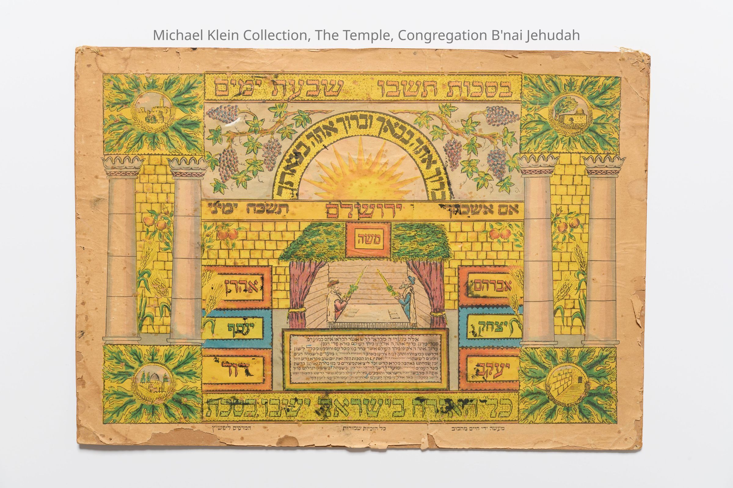 Decoration for the sukkah, colored lithograph, with verses and the names of the hospital, made by Haim Mahbub. The Lifschitz printer.Made/Created