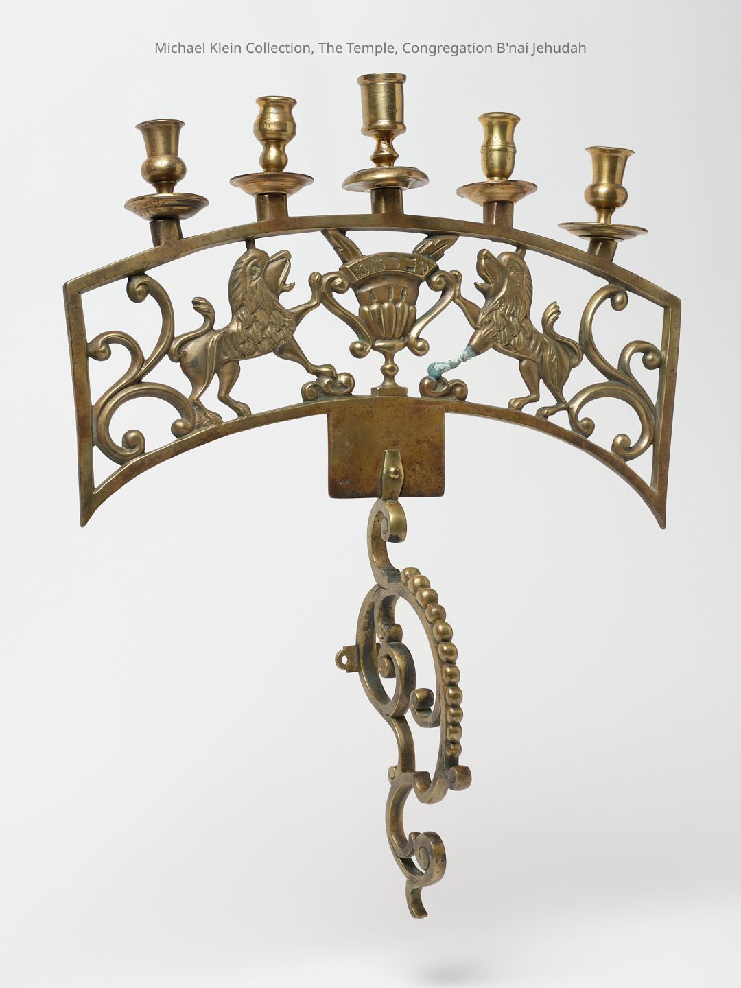 "hand" extended from wall to hold shaft. From side of ark. 2 lions, 5 lights. Inscription.