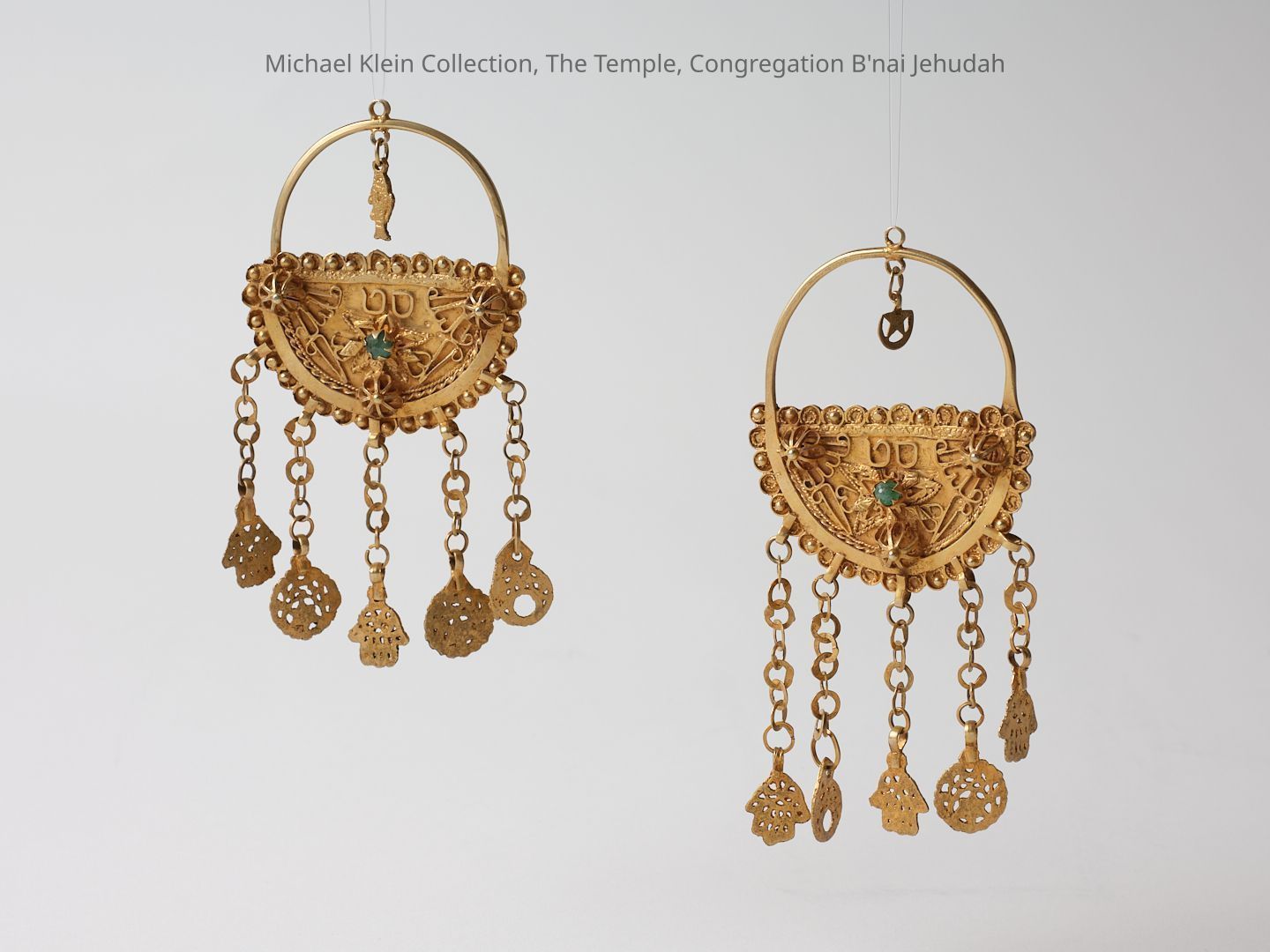 A pair of lavish head decorations – golden amulets – Tunisia pair of teklila (head decorations), everlasting amulets, intended to be hung on the sides of the head, near the temple. Gabes, Tunisia, [first half of the 20th century].soldered, cast and engraved silver; silver and granulation; Glass.Extra long head decorations. Each of the decorations consists of an oval hoop soldered to a semicircle-shaped plate. The plaque, with wavy edges, is decorated with silver thread and granulation in geometric patterns and red glass stone. From the bottom of the plate dangle five chains of round vertebrae and flatness (of the Rihanna type), with drilled pendants at the ends: two round with crescent decorations, two Hamsa-shaped, and one with star and crescent decoration. To the top of the hoop is attached another chain, at the end of which a hook is attached to hang on the head covering.Made/Created