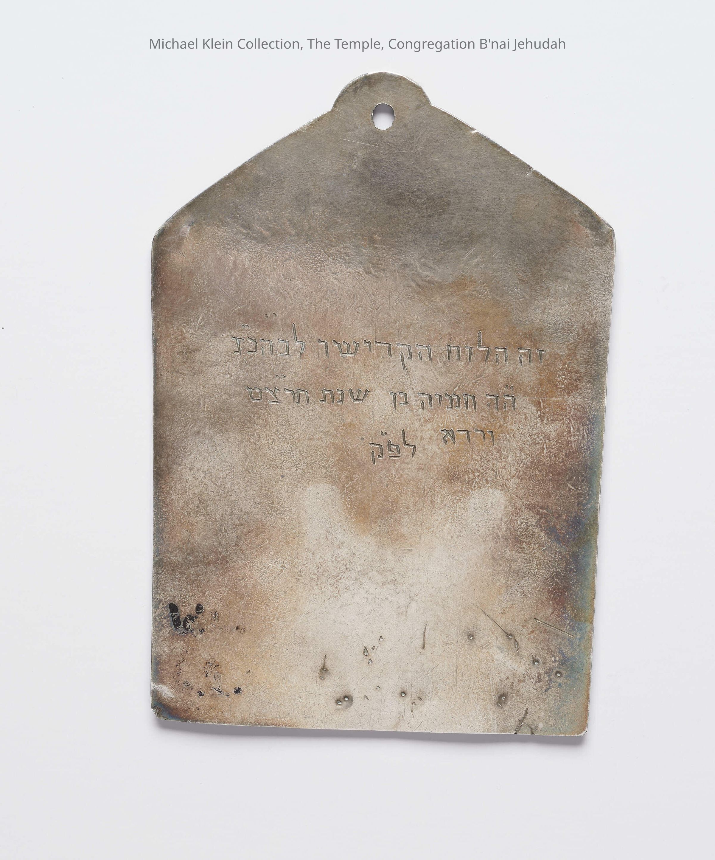 Designed as Tablets of the Law, engraved with Ten Commandments, and surmounted with ornaments in silver thread and granulation with suspension hole. Engraved Hebrew dedicatory inscription on back: "This plaque is dedicated to the synagogue by Hananiyah son of Varda, 5699 [1939]...".Made/Created