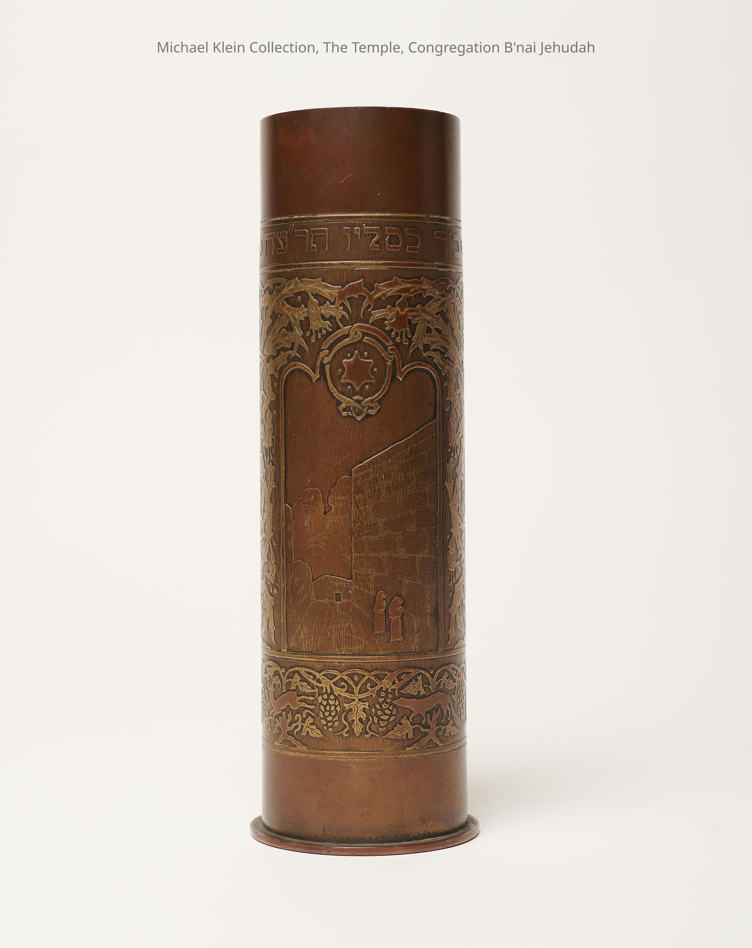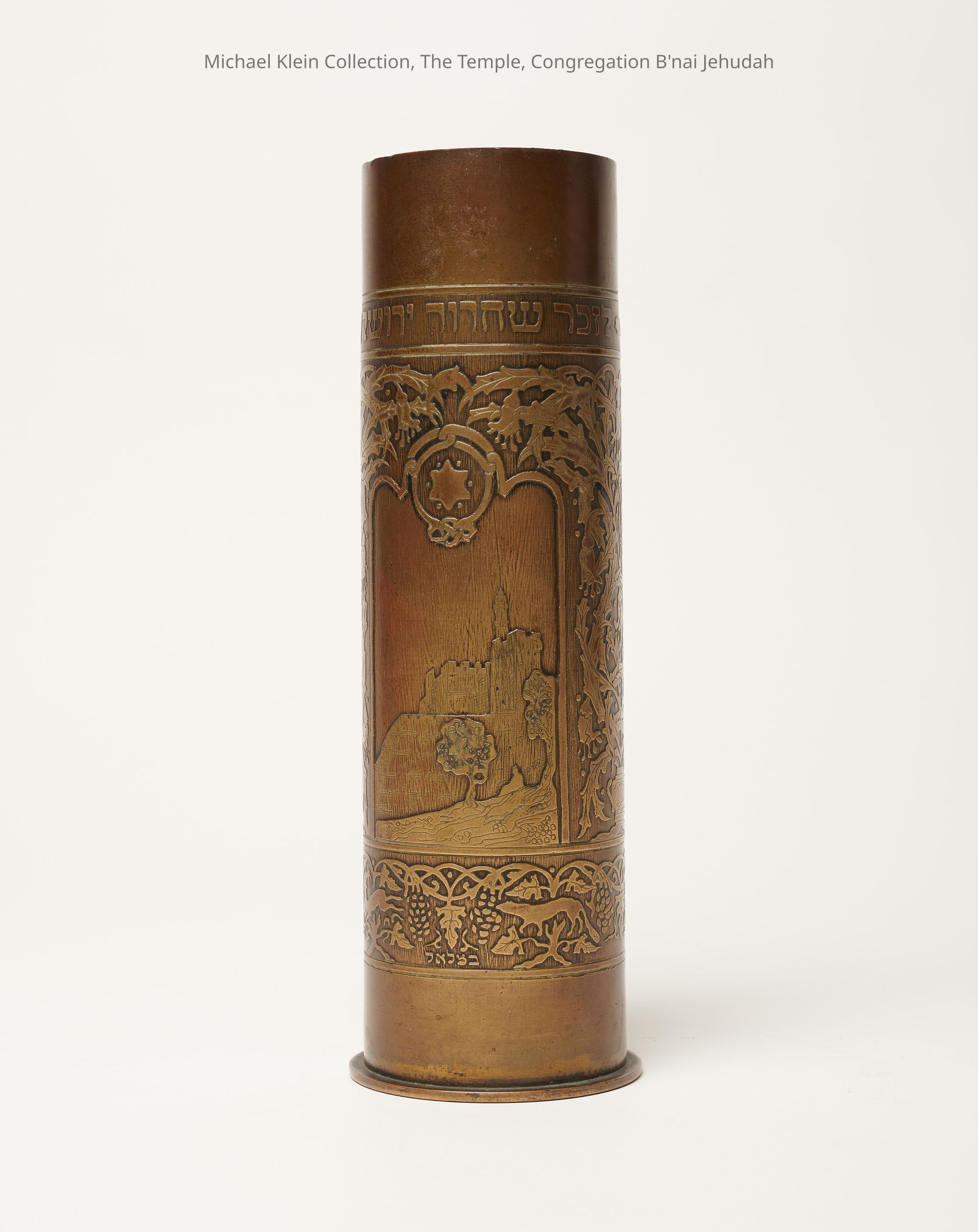 Originally a shell case, etched with scenes of Jerusalem and flora/fauna designs. Inscription, "Commemorating the liberation of Jerusalem 1917." Manufacturing marks on bottom.Made/Created