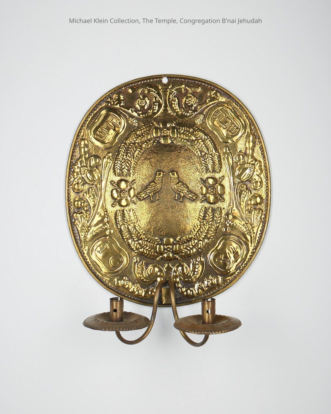 Hebrew: "Shabbat Kodesh" (Holy Sabbath). Flowers, leaves around border. Hangs on wall with 2 candle holders coming out.Made/Created