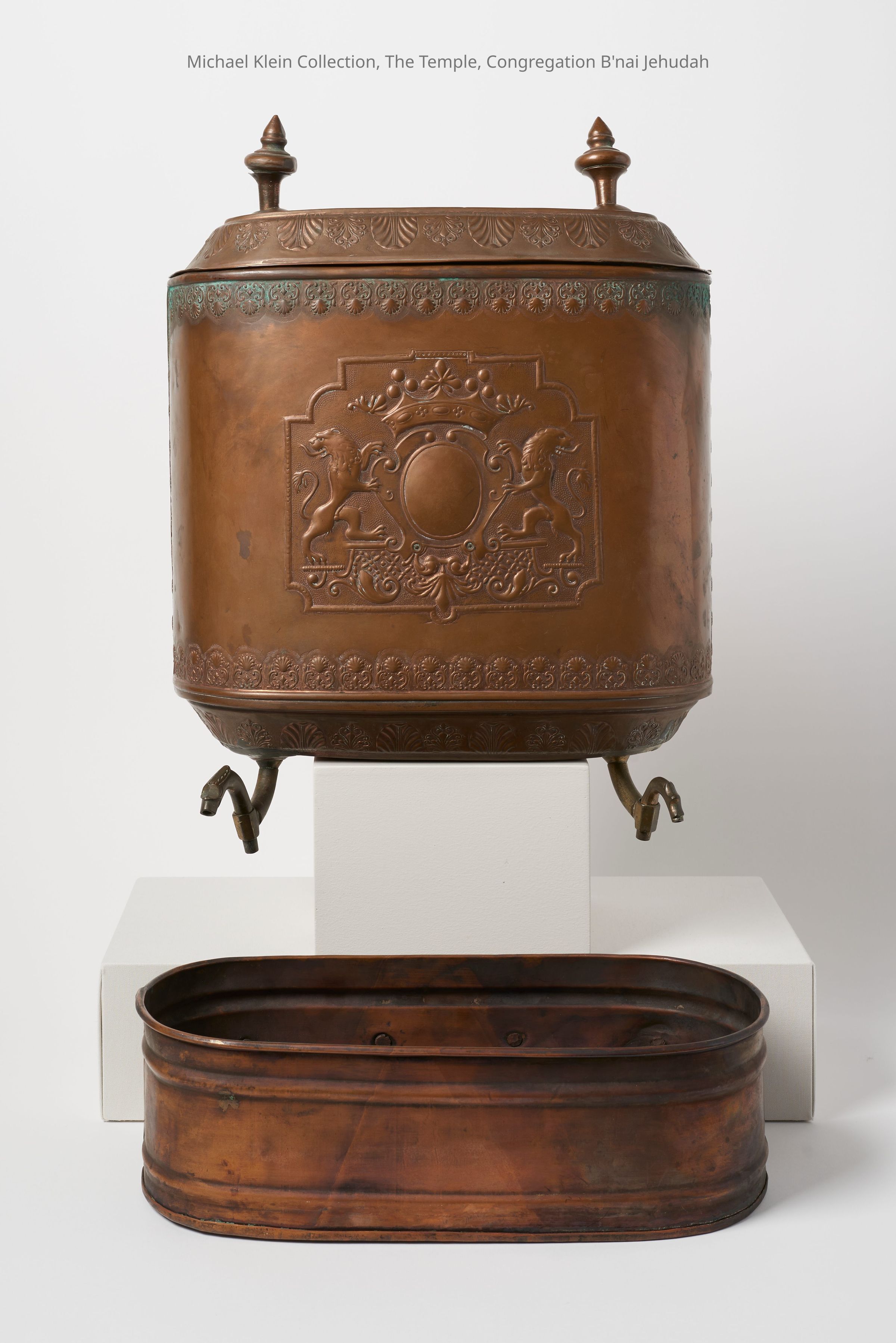 Rampant lions and shield on tank as well as a shape that is similar to a Torah tik/mantle. Two pieces.Made/Created