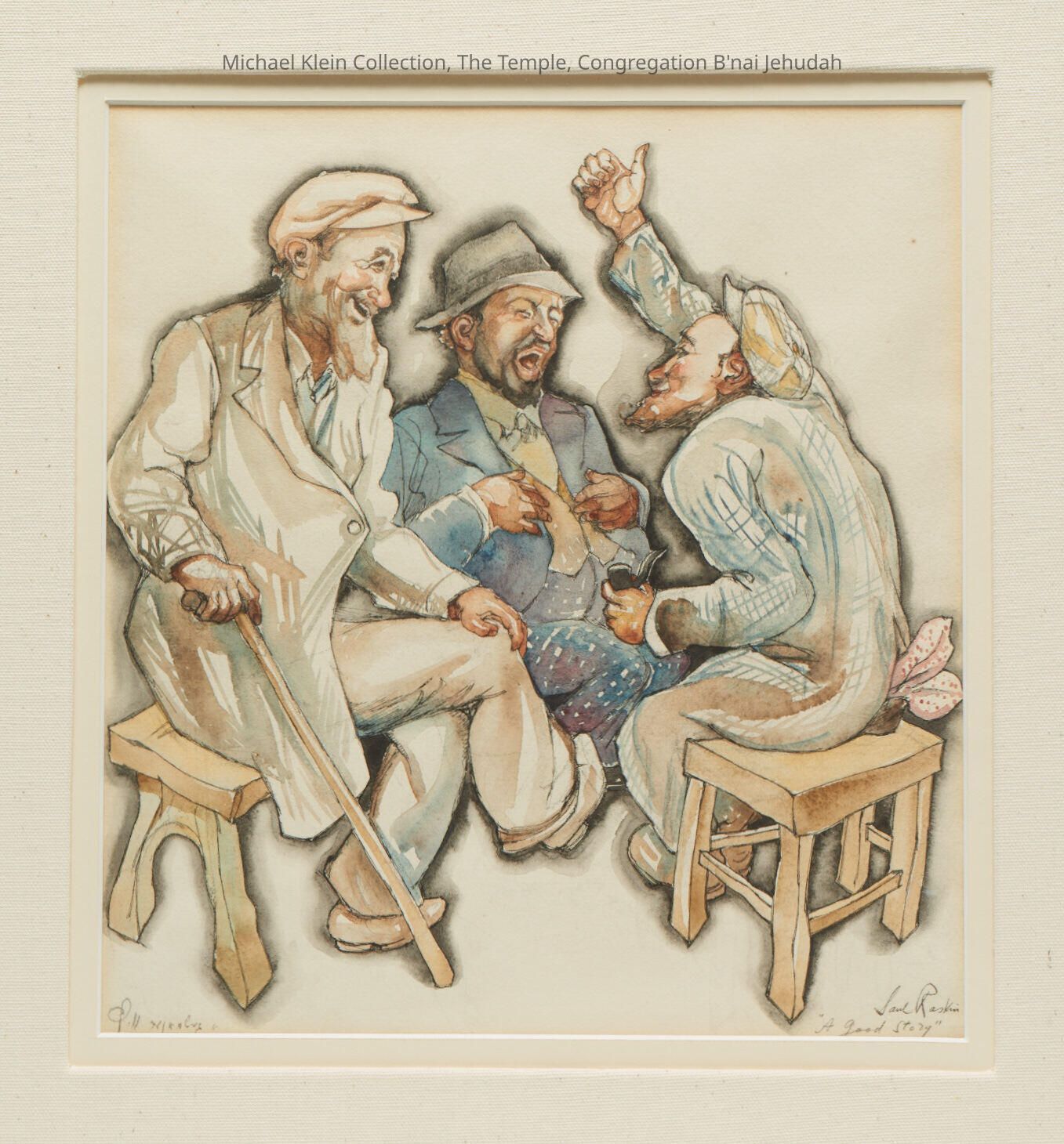 "A Good Story." Three men sitting together and laughing as the man on the right gesticulates, his right arm in the air. Man on left holding a cane. Man in center wearing a blue suit, all three wearing hats.Made/Created
