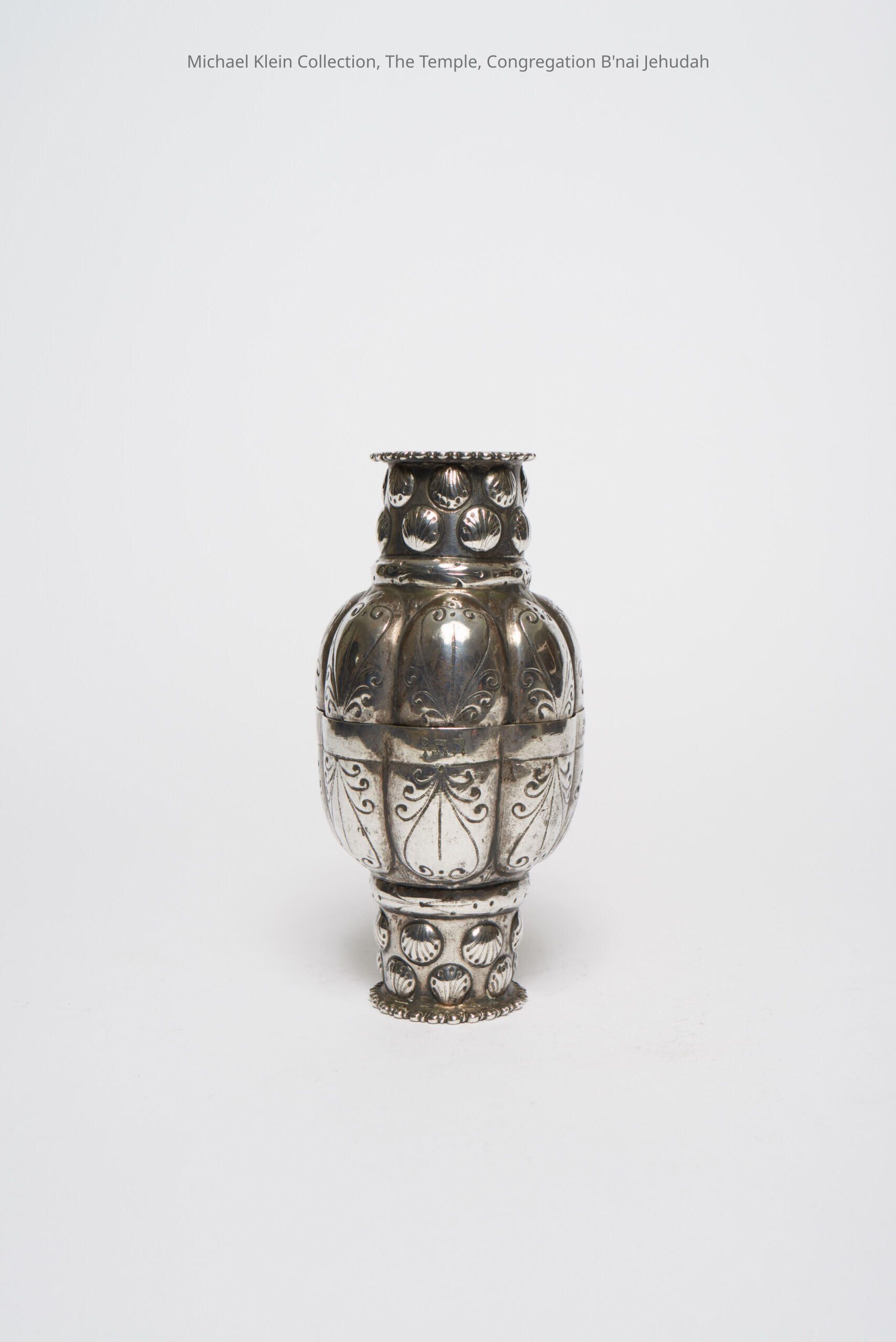 Interlocking cups engraved with "happy bride and groom" and an acronym for "mazel tov."Made/Created