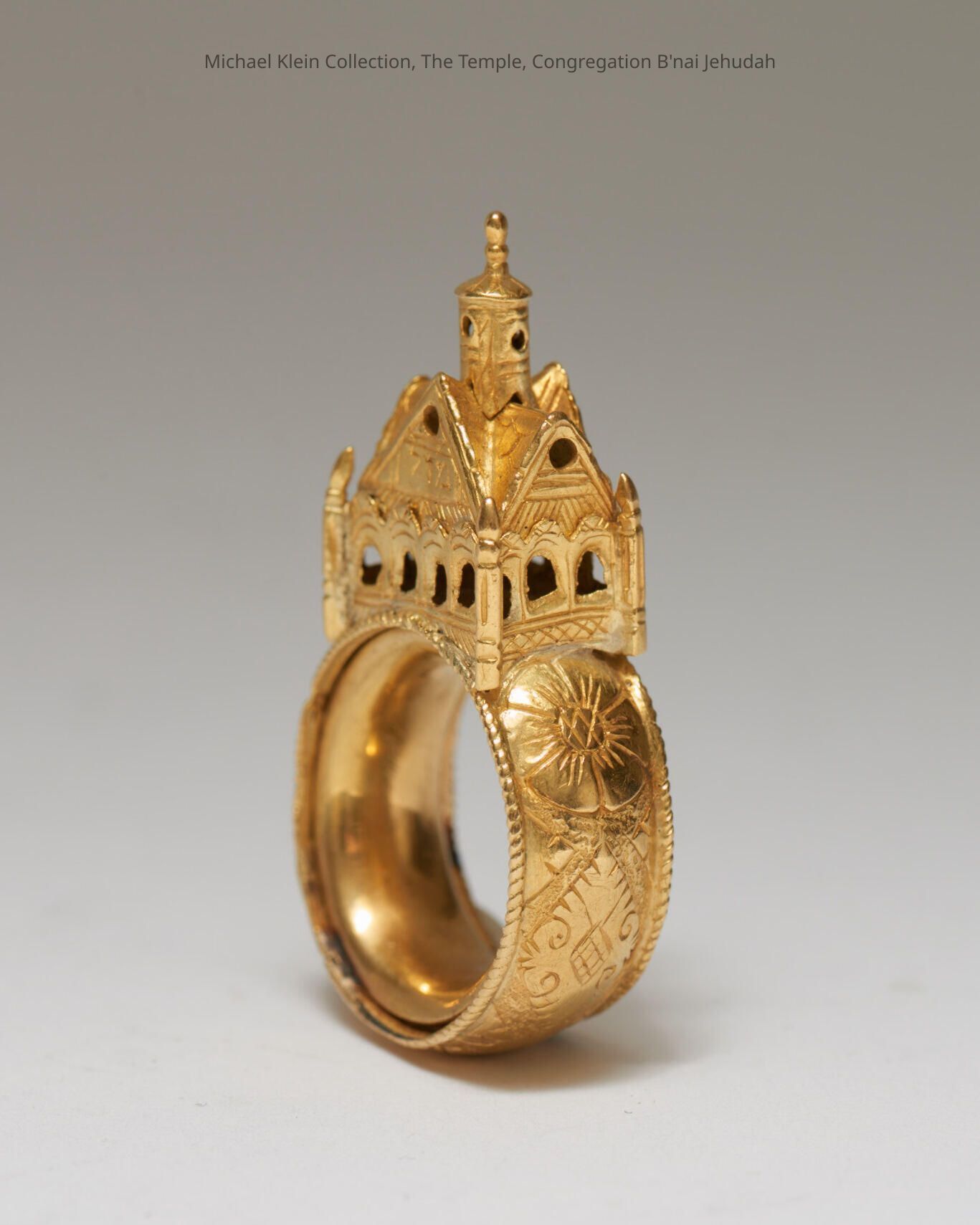 The castle-shaped top of this ring is engraved "Mazel Tov." This ring would have been worn by a bride during a wedding and exchanged for a plain band as part of the ceremony.