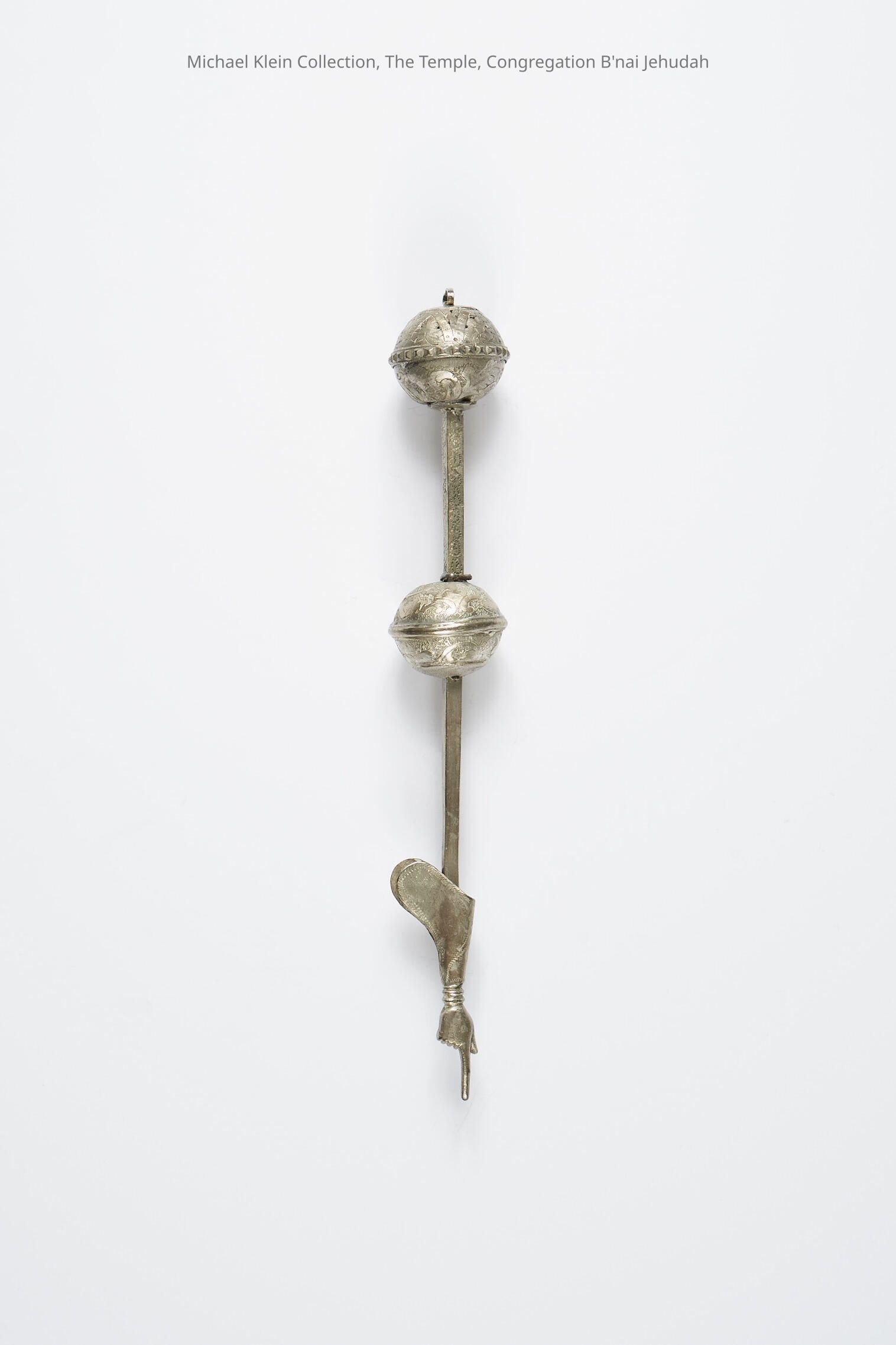 Sephardic design with quill; large engraved ball at end and one in center.Made/Created