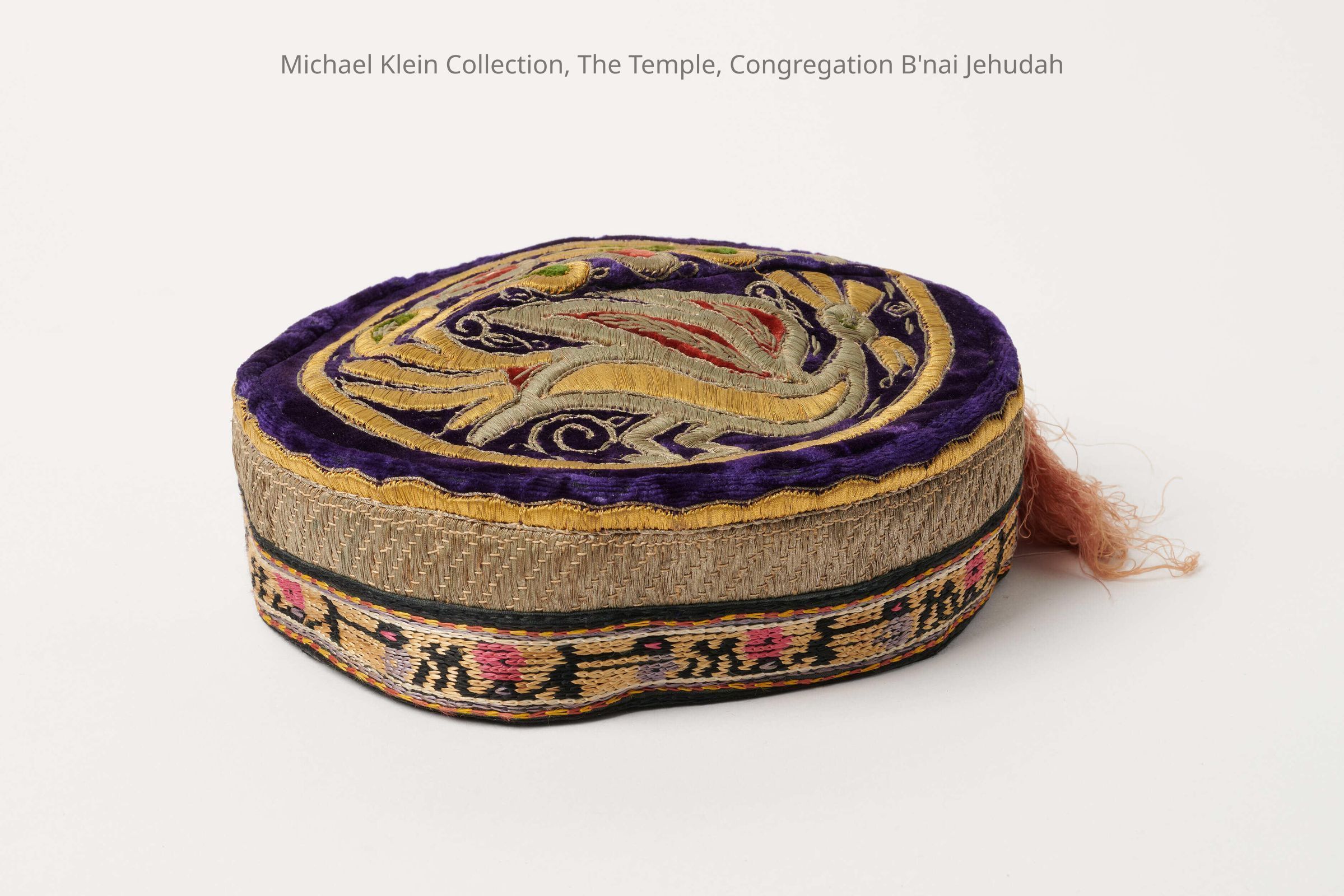 Kippah/yarmulke. Purple velvet, gilded silver embroidery in form of a peacock. (Spanier arbeit)Made/Created