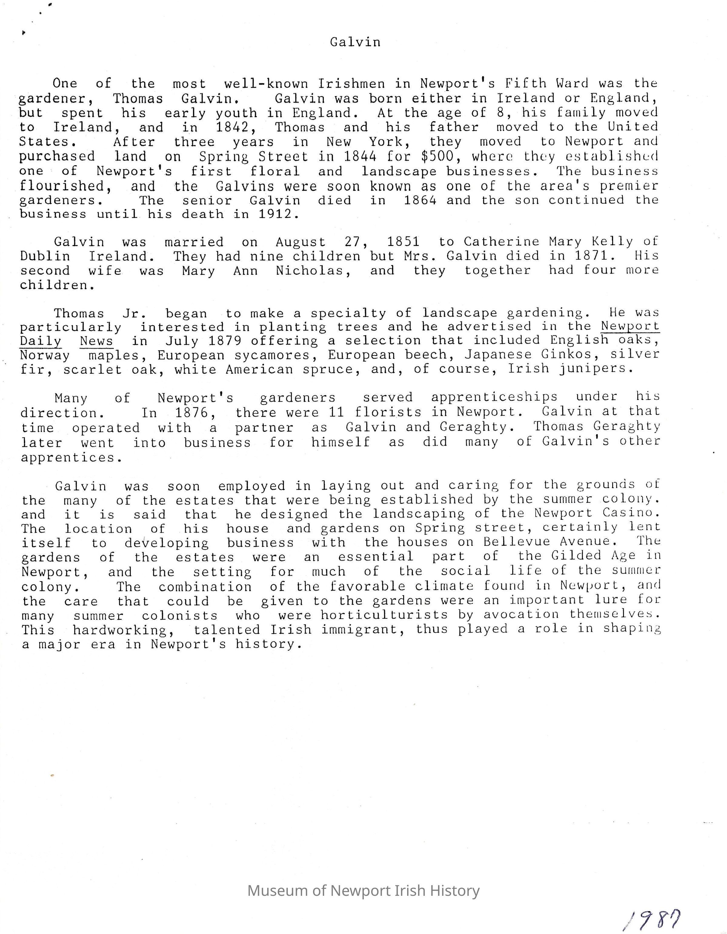Thomas Galvin, gardener article