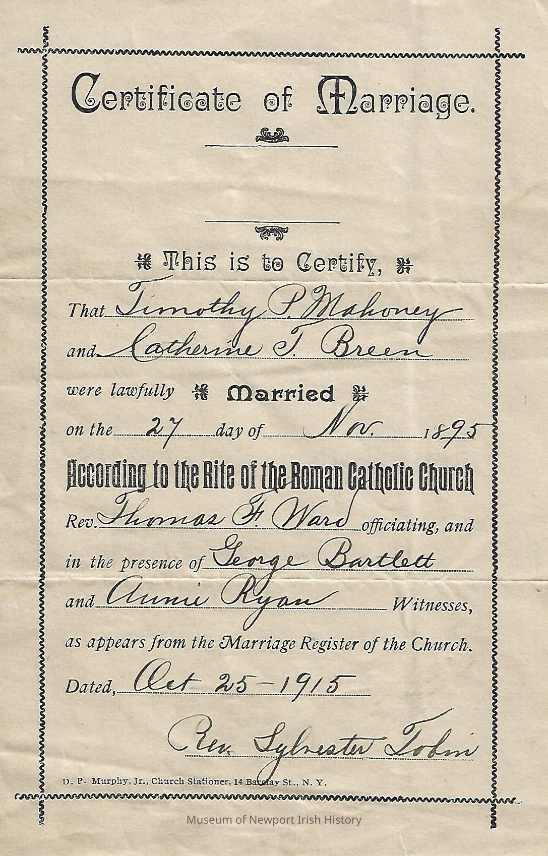Timothy Mahoney and Catherine Breen Certificate of Marriage