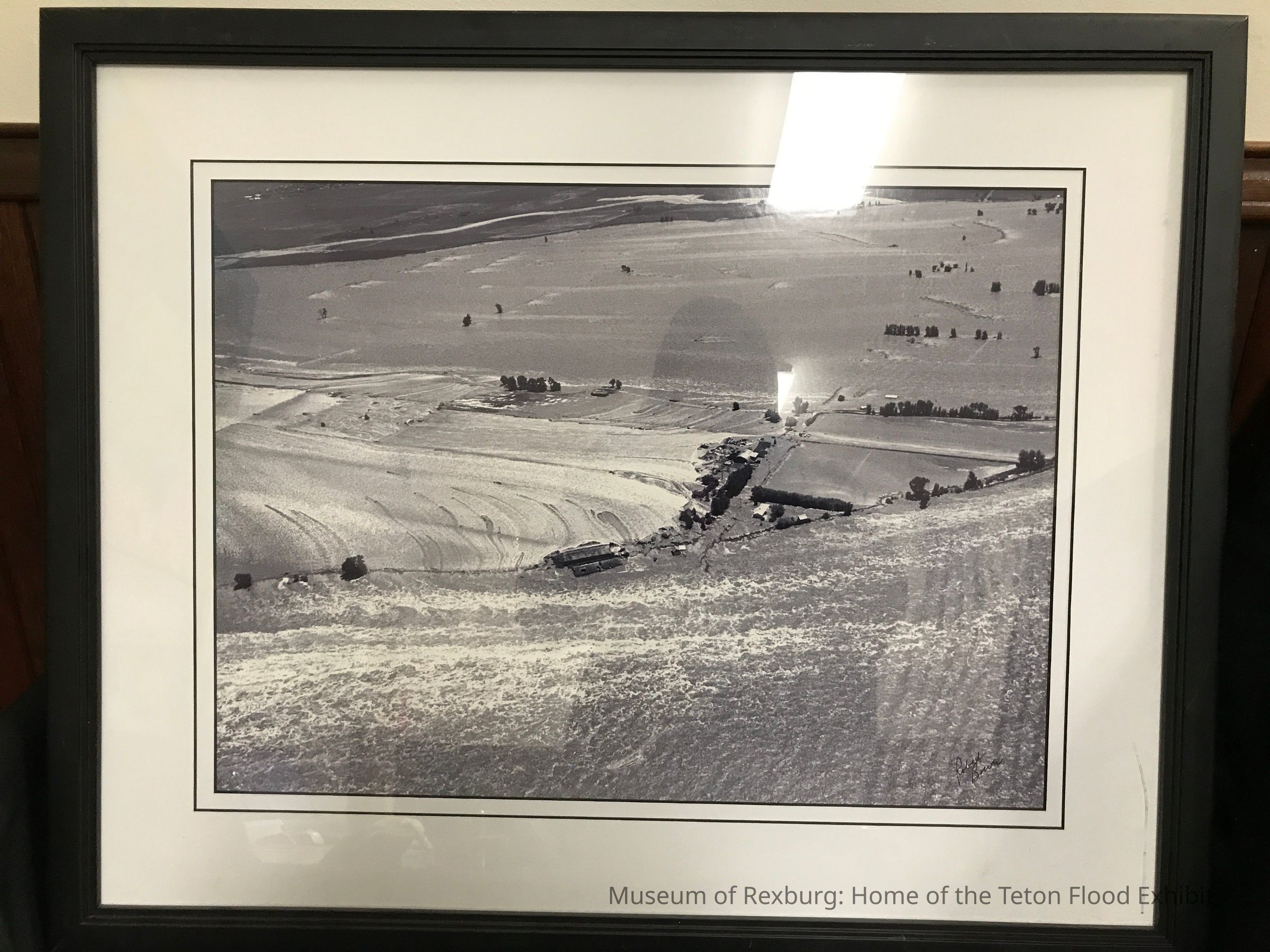 This photo is in black and white and depicts the flood waters on 1976. This photo is 25.5 x 31.5 inches big. This photo depicts homes that are floating away and the flood wave coming in from the left side of the picture heading to the right. This picture is in a black frame with white borders around the picture. There is the name Robert Baur on the bottom corner.