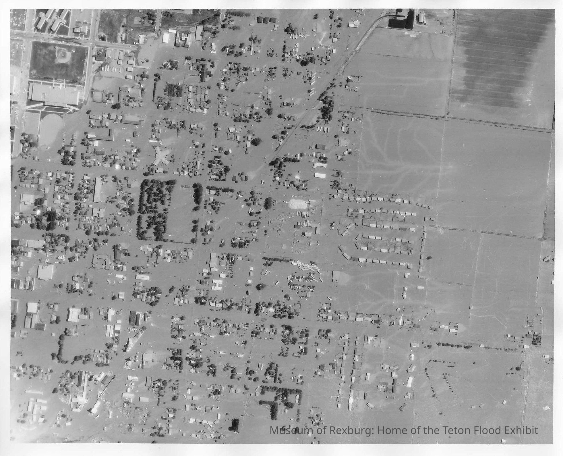 This photo is black and white 8x10 and is an aerial photo of Rexburg. On the back it says Town/Petro Ak902 5 June 1976 1645 T KS 87 Rexburg, Idaho in blue marker. The whole photo is flooded except the top left corner of the photo.