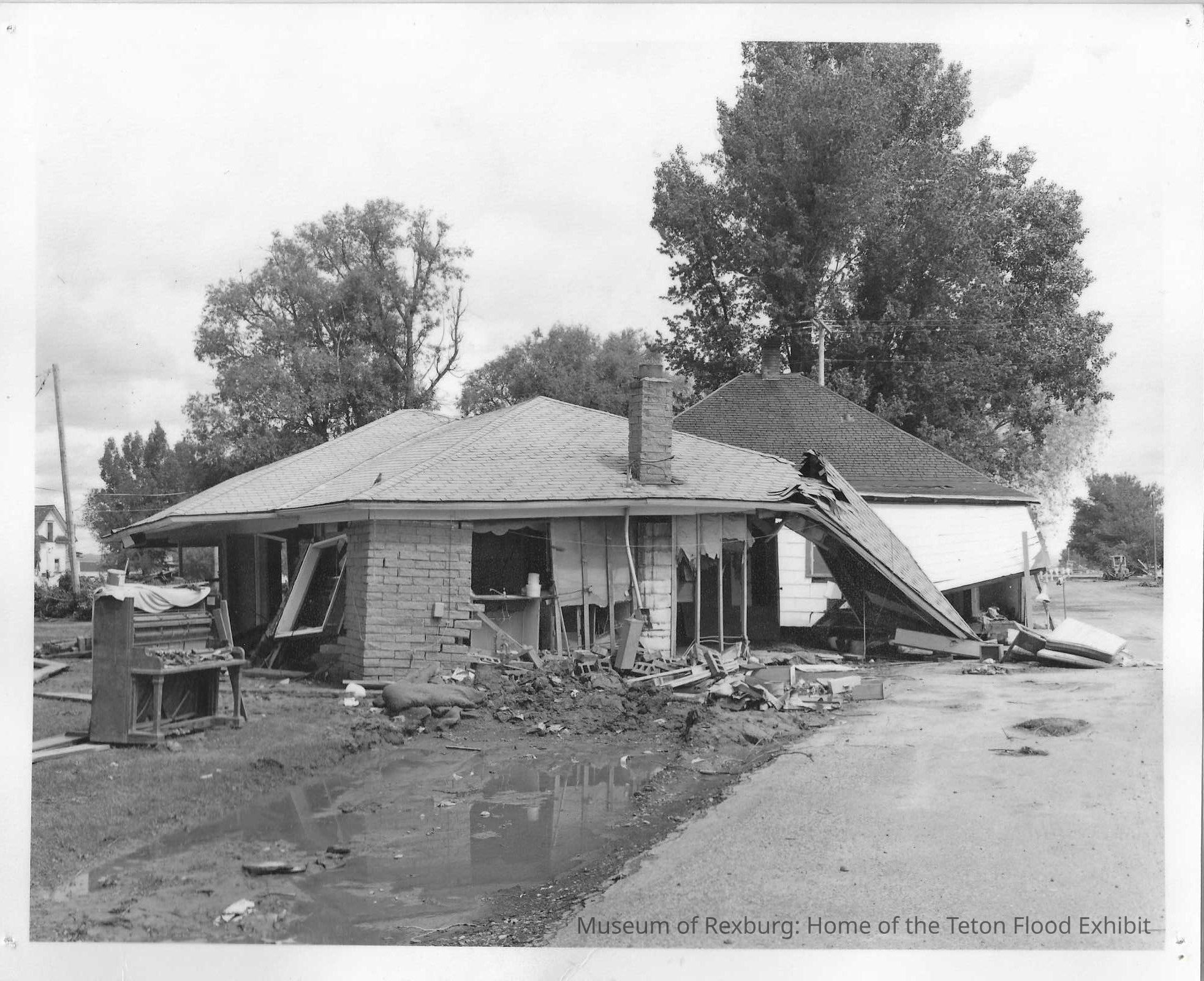 This photo is an 8x10 and is black and white and is also laminated. A severely damaged brick home is in the center of the photo. The outer wall is gone and part of the roof is snapped off and hanging. There is a white board home nestled up against the brick. There is water, mud, and debris scattered in the foreground. There is a piano in the left bottom corner area. The words P549-100-281-A Teton Project, Idaho This house in Sugar City shows damage from the flooding caused by the break in the Teton Dam. 6-18-76 Bureau of Reclamation photo by Glade Walker is written in the back in the center. The words Credit U.S. Department of the Interior Bureau of Reclamation Region 1 Box 043- 550 W Fort St Boise Idaho 83702 P-549-100-281 I is written in the bottom left corner. The words 3 top 4 are written in the top left corner in pencil.