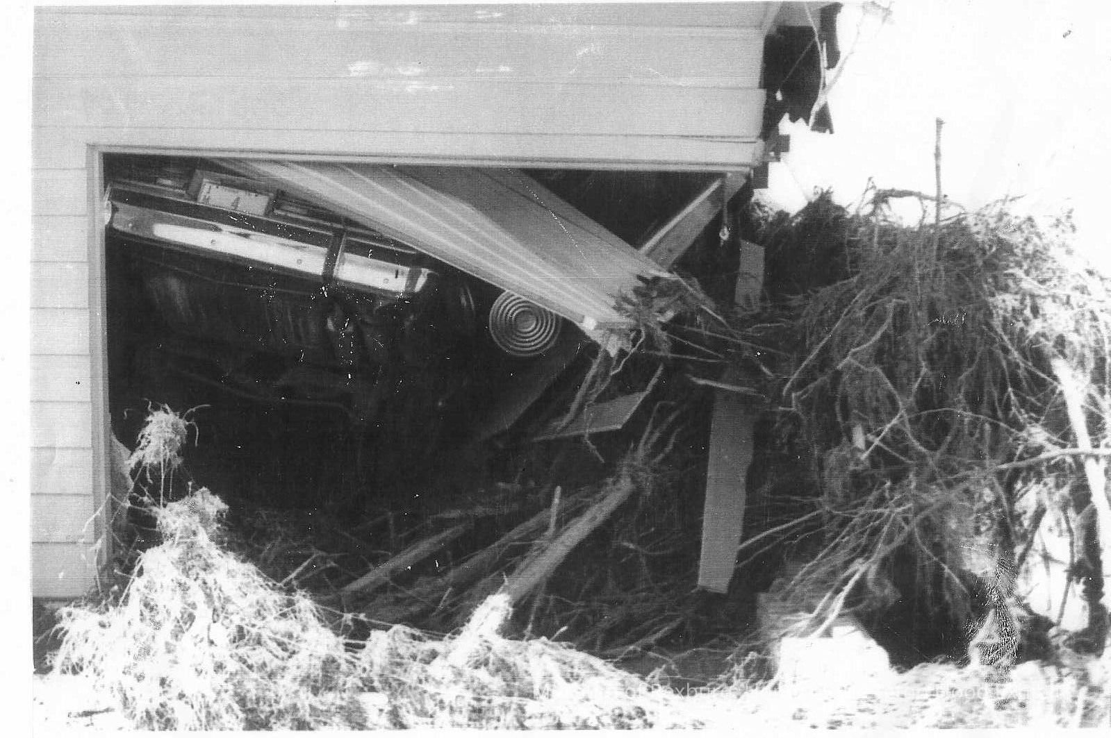 This photo is an 5.5 x 7.75 inches and is black and white. What looks like an automobile is in the top left corner. The automobile is in a garage looking structure that is full of grass and tree branches and the automobile has been pushed up into the corner.