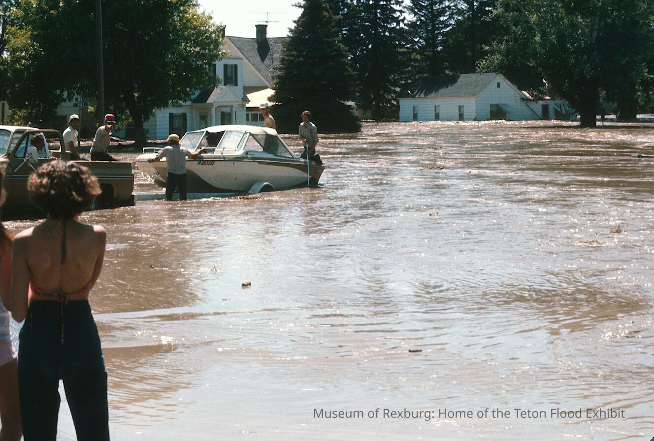 The photo was taken in colour. The subject of the photo is a group of people getting a motorboat out onto the flooded streets. In the left hand corner are two women wearing biking style tops, and one is wearing acid washed short shorts, and the other who is mostly in the shot is wearing black pants. The photo is a part of a digital collection donated to the museum by Rick Davis.