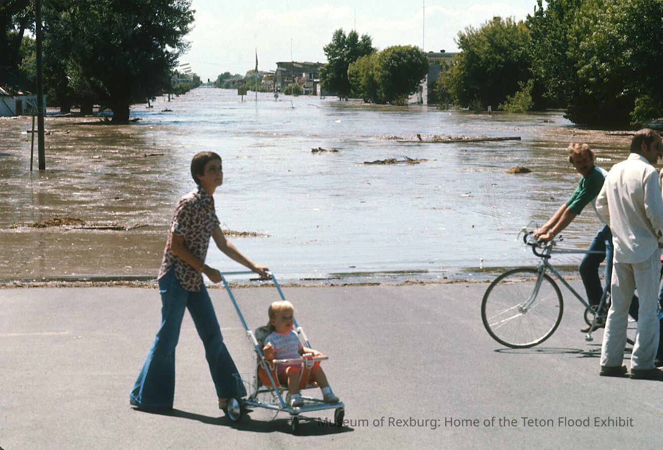The photo was taken in color, on a clear day. The Subject of the photo is flood waters on the 3rd E 1st S. In the foreground of the shot is a woman in a white button up with red floral print in bell bottoms walking a baby. To the right of her is a man wearing a green half sleeved shirt on a powder blue bike. Next to the man on the bike is a man wearing a white long sleeved button-up, white pants and dark shoes. The photo is a part of a digital collection donated to the museum by Rick Davis.