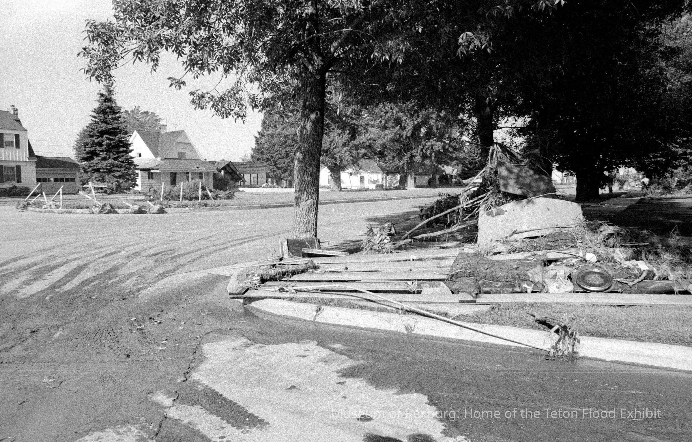 The photo was taken in black and white. The subject of the photo is 3rd E and East Main. The foreground of the photo is the road covered in mud. In front of the photographer there is a circular object that looks similar to a hubcap to a car. Near the object is another metal object that appears to be protruding from the ground. The left hand side of the photo has houses and a wide open road. The photo is a part of a digital collection donated to the museum by Rick Davis.