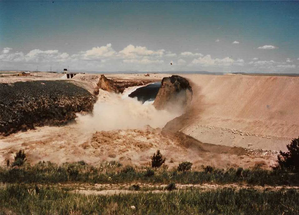 This photo is in color and shows the reservoir emptying into the valley as it washes the dam away. This photo is in landscape position.