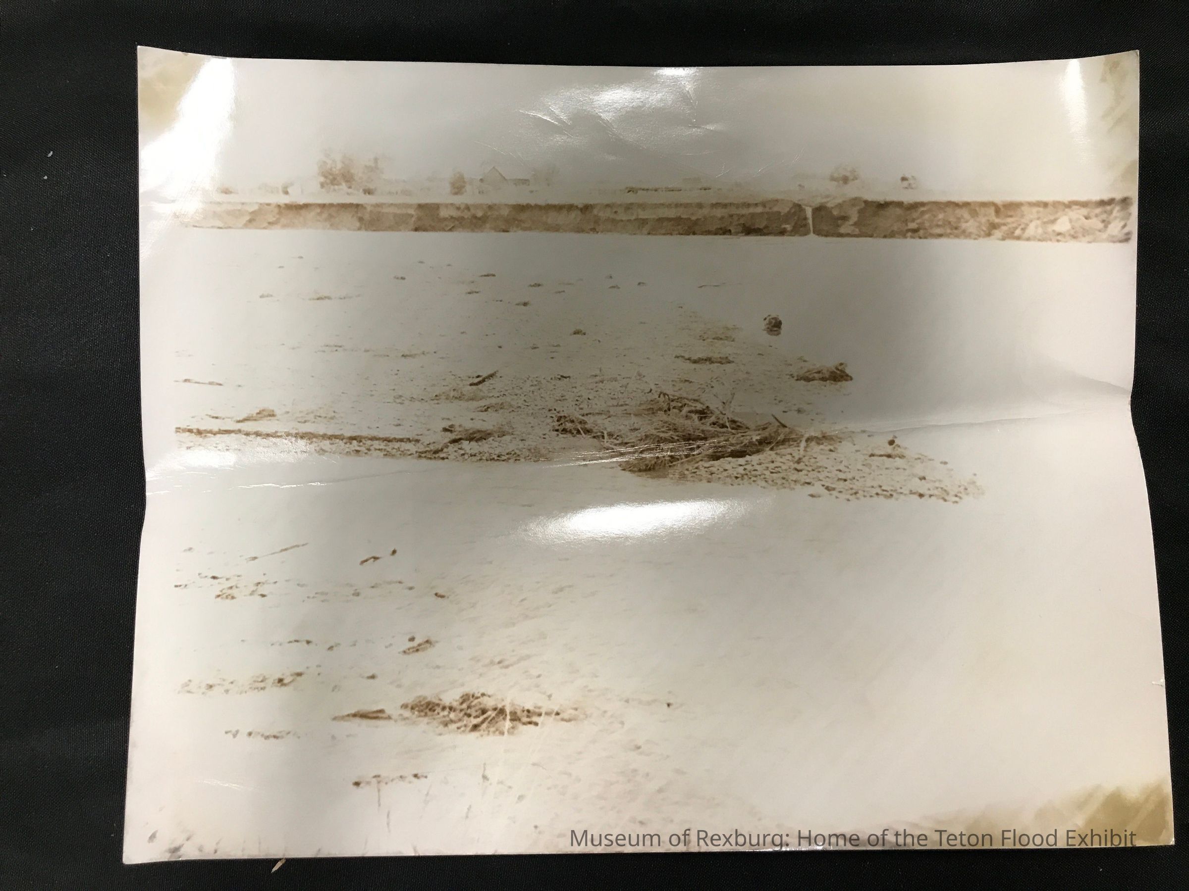 These pictures we are assuming are from the Menan Butte area because one photo contains the Menan Butte a.k.a. the "R" mountain. They can be found in the Mary Smith Archive under folder B14. The folder name these photos were found in the folder B14 with the name "Teton Dam Case Clippings (2)". The name given to these photos in the Mary Smith Archive is "row186.MscPhotos". This photo shows some flooding along a riverbank and some debris along the bank. This photo is extremely faded and it is hard to determine what the actual subject of this photo is. This photo is 11 x 14 inches big. This photo is black and white. This photo is associated with: 2020-20-011, 2020-20-012, 2020-20-013, 2020-20-014, 2020-20-015.