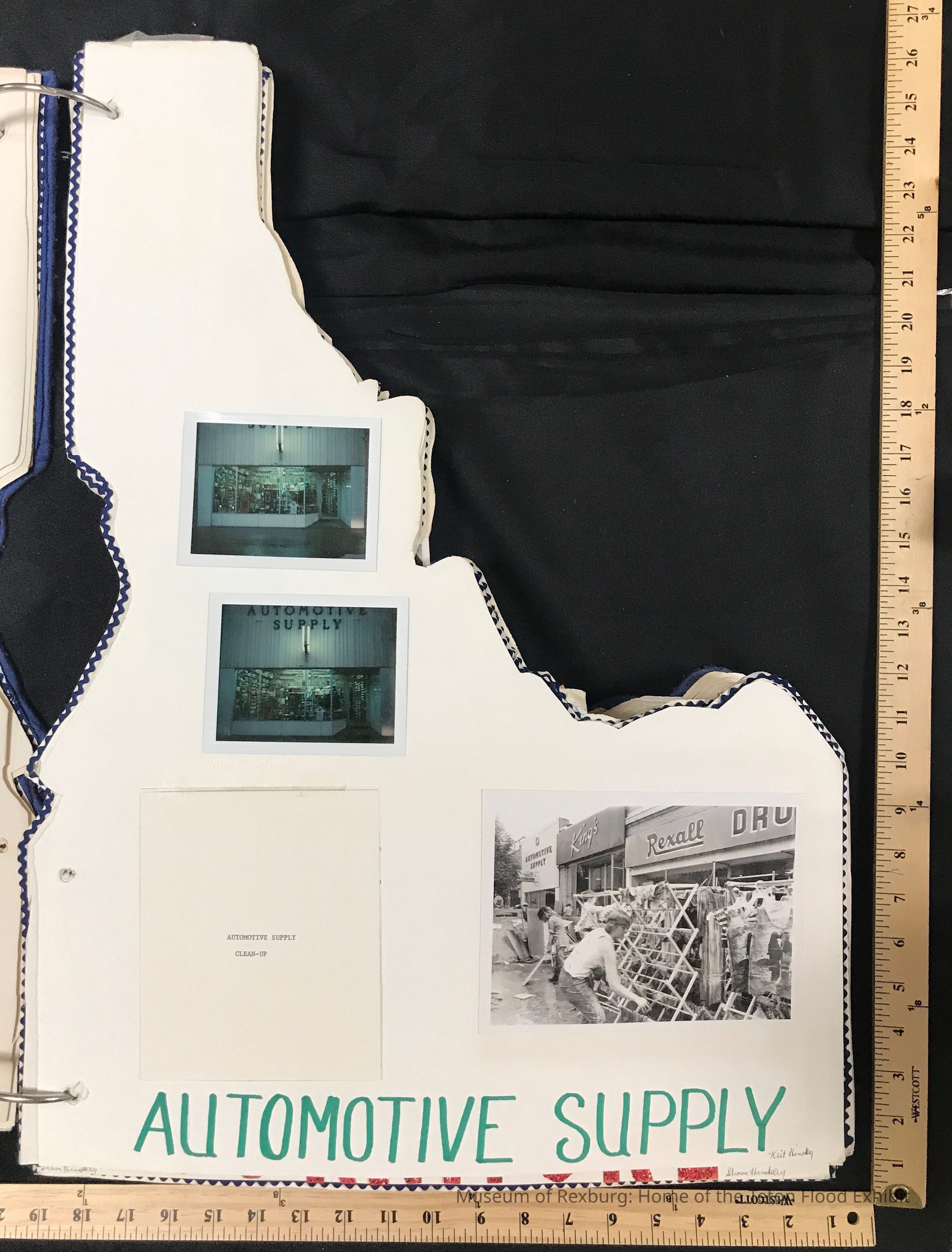 Page featuring Automotive Supply. The note reads: Automotive Supply collected enough mud and dirt to plant a crop in. The debris was deep and filthy on the inside and out. The clean-up was busy and involved. On the outside the windows were replaced, the frames were drenched and had to be replaced. General cleaning was completed of all the outside area. Painting was one busy job for awhile. A new door was installed.