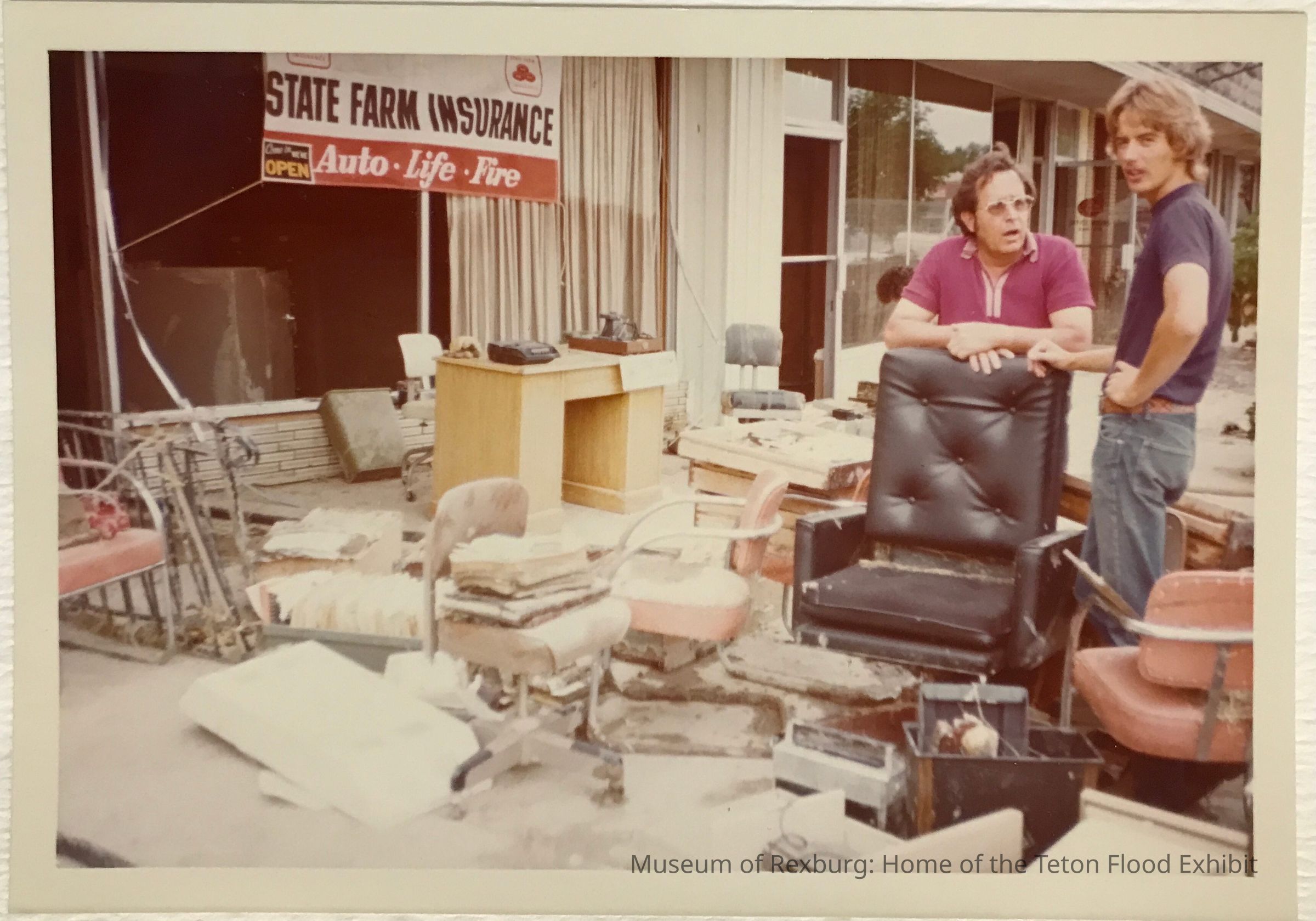 The 3rd photo of Wells Grover Building shows flood damage -- office furniture pulled out of the stores. Two men are standing to the right of the photo.