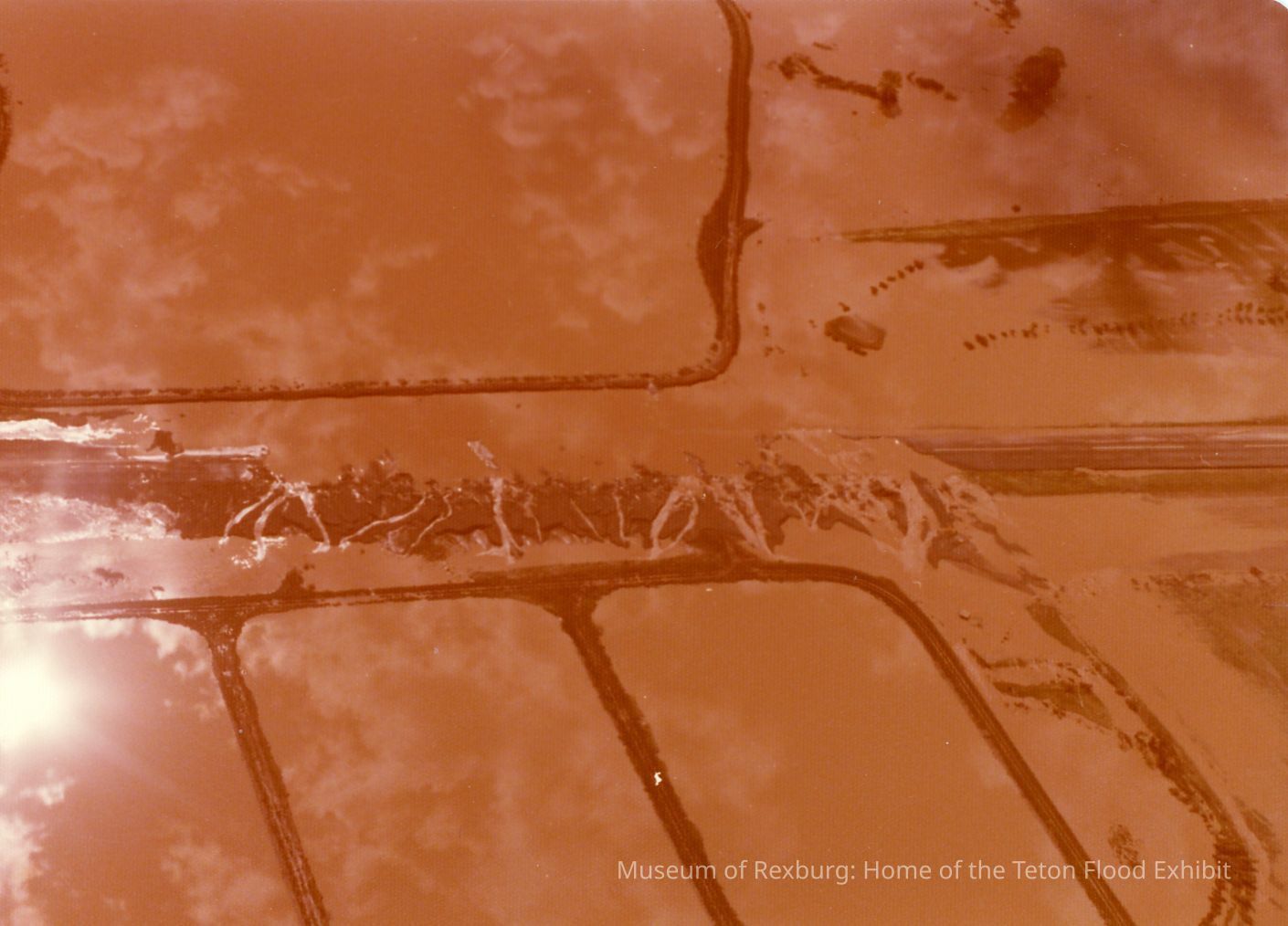This Photo is in color but is extremely over-exposed or faded. This photo has rounded corners. This photo is 3.5 x 5 inches big. This photo came with 23 other photos. This photo was donated by Verl Soderquist. He was going through his father's photos and found them. His father lived in Teretan, Idaho. The photo was ran through a cleaning program and he added comments about what he speculated in the photo. Those photos can be found the Museum's Terabyte external storage drives. This photo shows different flooded sections of what appears to be farmland. In the center of the photo we can see trickles of water as it moves from the top of the photo down towards the bottom.