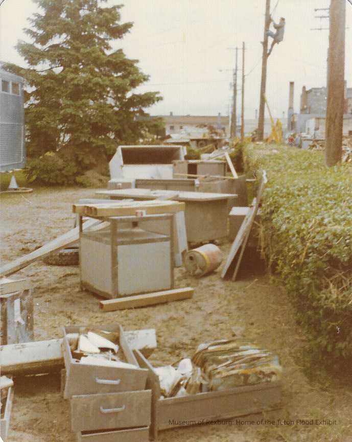 The photos is in colour. The subject of the photo is of office supplies scattered across the ground in a residential area. The photo was taken on a day with some overcast. The sky is gray. There is some foliage next to the debris, and near the homes in the photo. The dimensions of the photo are 5" X 3.25" This photo comes from the old Standard Journal Warehouse located at 23 S 1st E.