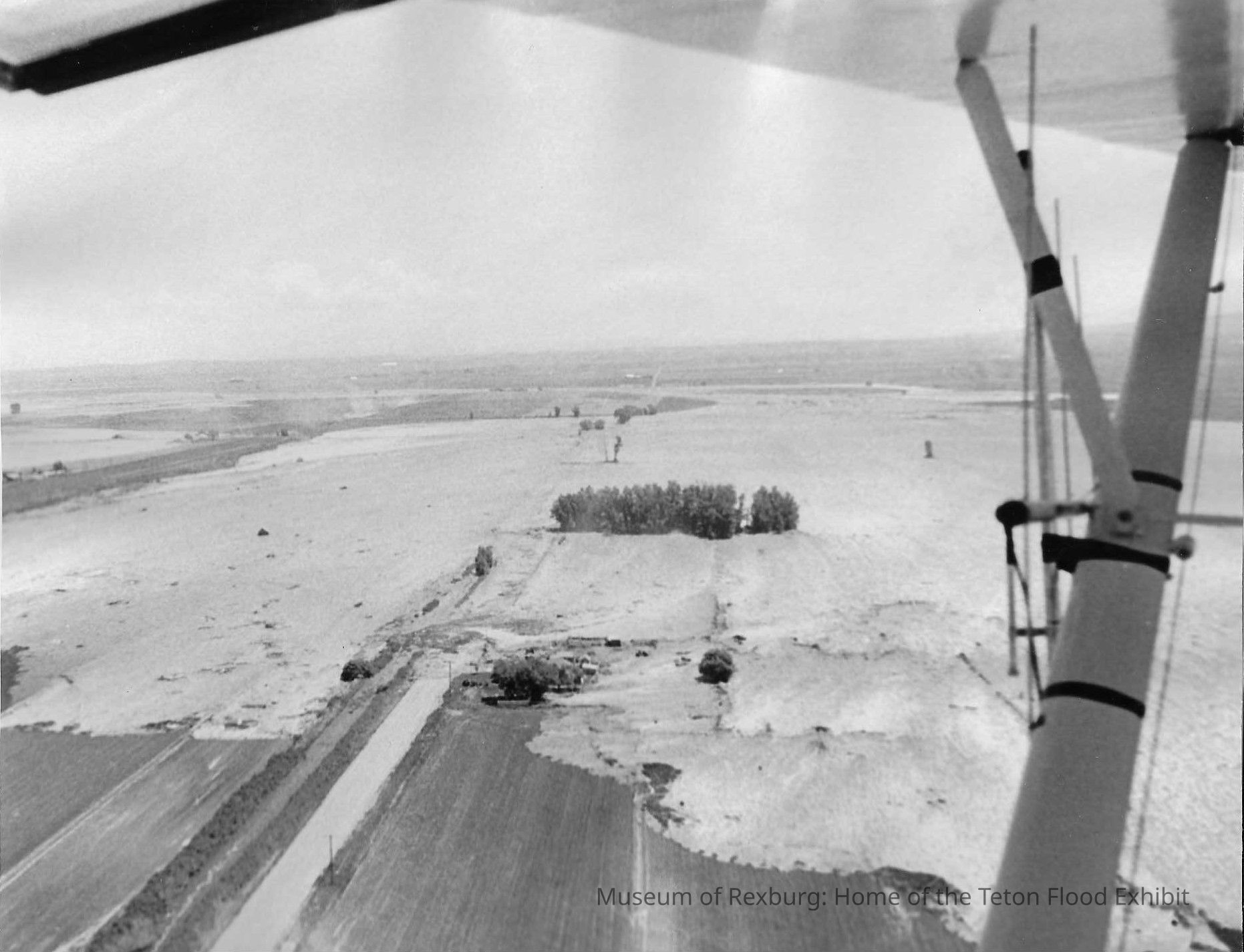 This photo is black and white and shows the wave of the flood headed down farmers fields and a road. This photo was taken from the air because we can see the wing of the plane to the right side of the photo. This photo is 7.25 x 9.25 inches big. This photo comes from the old Standard Journal Warehouse located at 23 S 1st E.