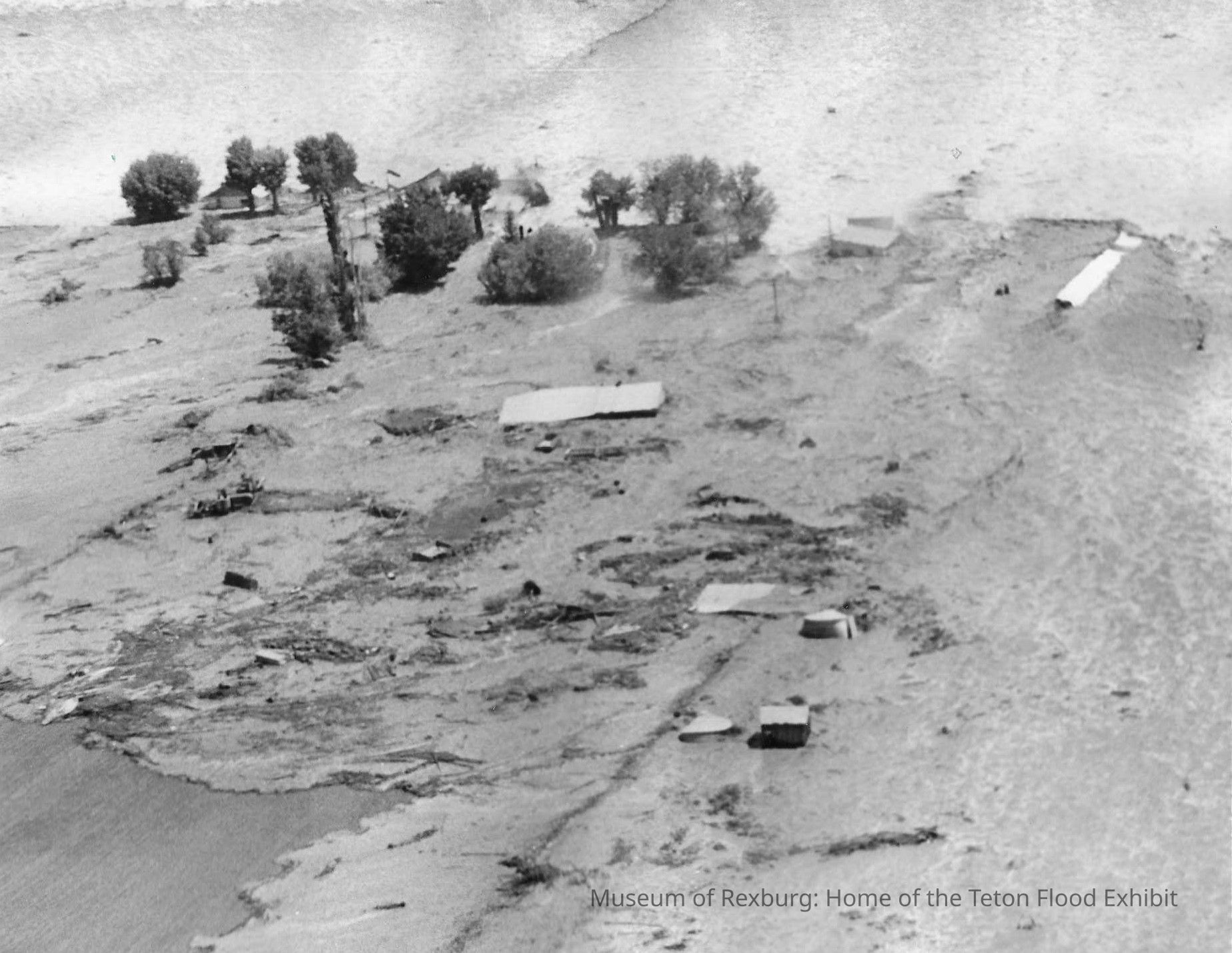 This photo is black and white and shows the flood waters carrying lots of debris washing through a farmers field. We can also see a few trees in the background. This photo is 7.25 x 9.25 inches big. This photo comes from the old Standard Journal Warehouse located at 23 S 1st E.