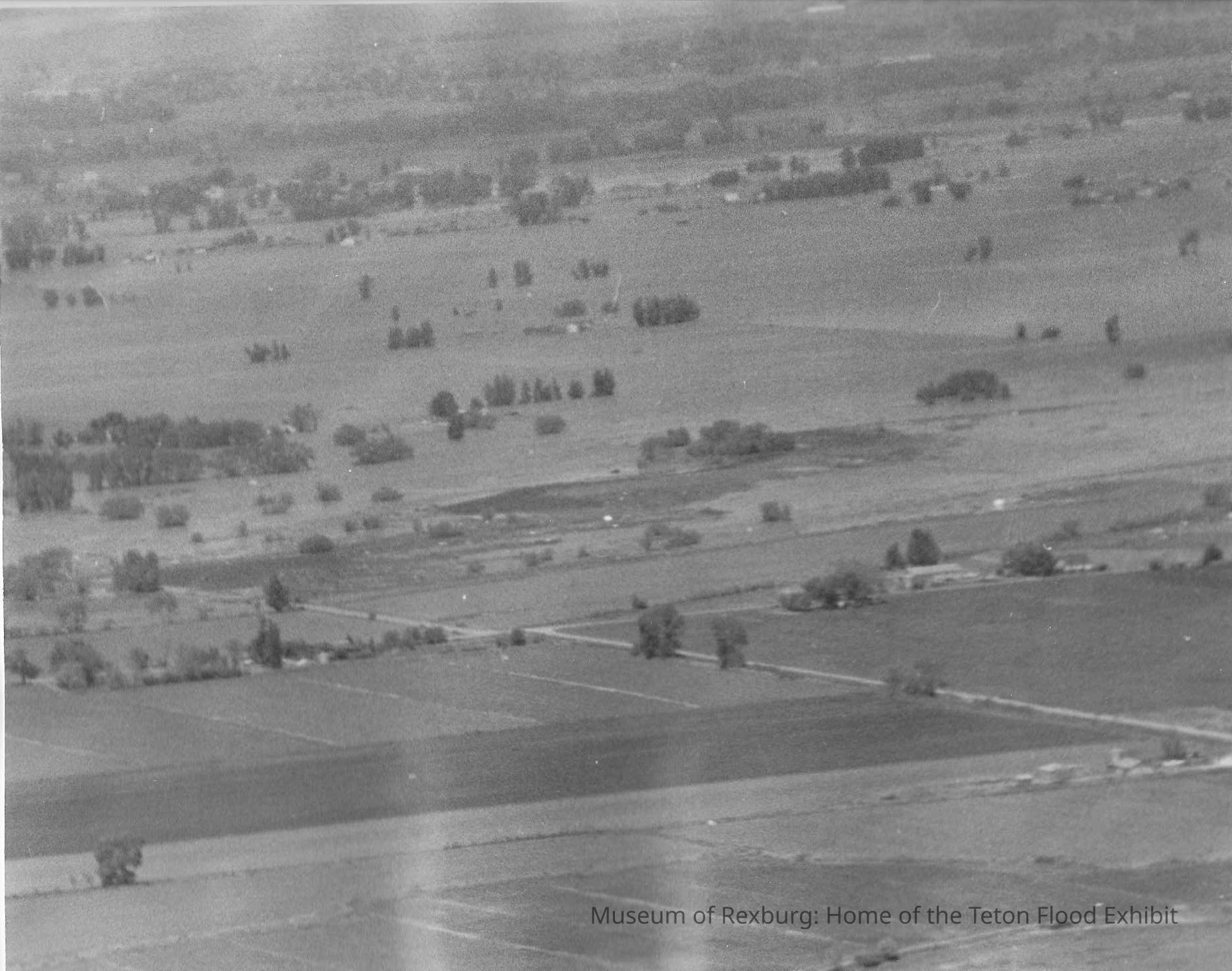 The photo is in black and white. The subject of the photo is a flooded country side. The photo itself is quite blurry, but the subject matter is still clear enough to see. There seems to be no homes or towns in the close proximity of the photo, however the flood waters are coming from the top of the photo. The dimensions of the photo are 7.25" X 9.25". This photo comes from the old Standard Journal Warehouse located at 23 S 1st E.