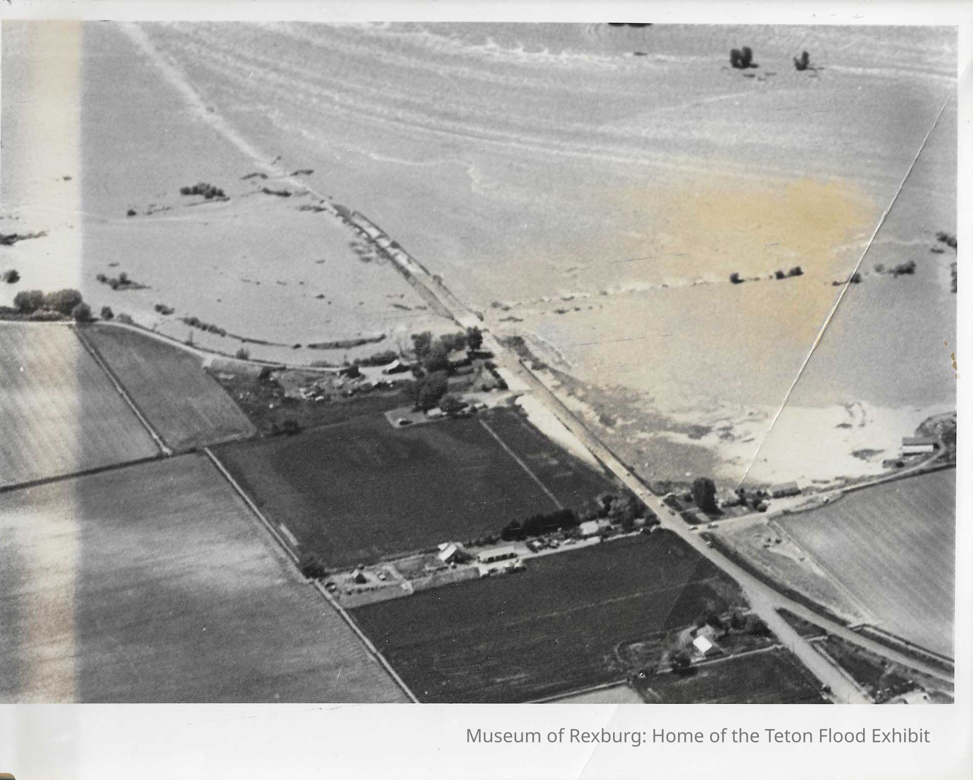 This photo is black and white and shows a few farmstead homes and surrounding farmlands being washed away by the floodwaters. We can also see a few cars still on the road that goes down the center of this photo. This photo is 8 x 10 inches big. This photo comes from the old Standard Journal Warehouse located at 23 S 1st E.