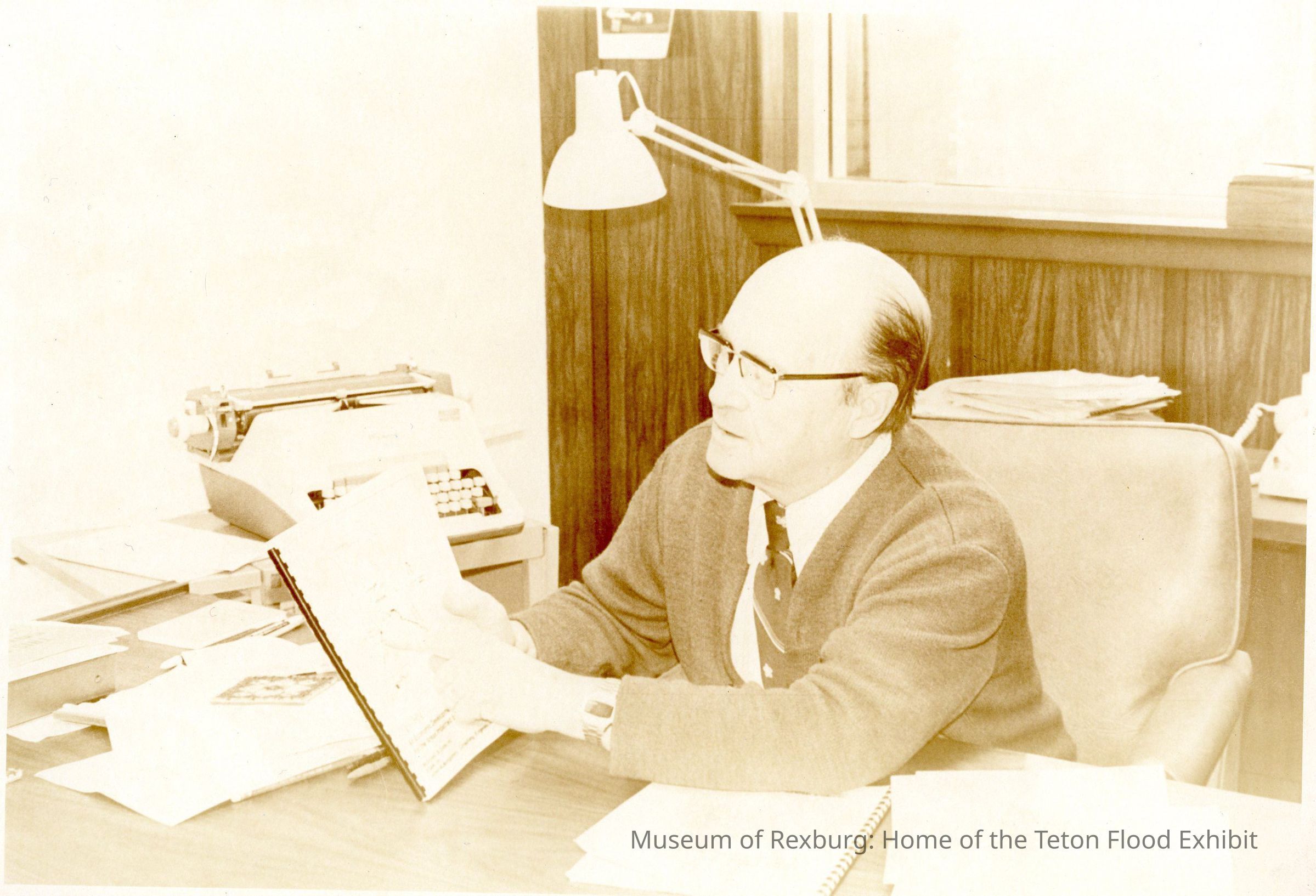 The photo was taken in black and white. However, during the processing of the photo, it seems to have been exposed to to much light, giving it an over saturated look. Although it is relatively unclear, the subject is still visible. The subject of the photo is a man who is balding sitting at his desk and pointing to a stack of documents. The dimensions of the photo are 7" X 11". This photo comes from the old Standard Journal Warehouse located at 23 S 1st E.