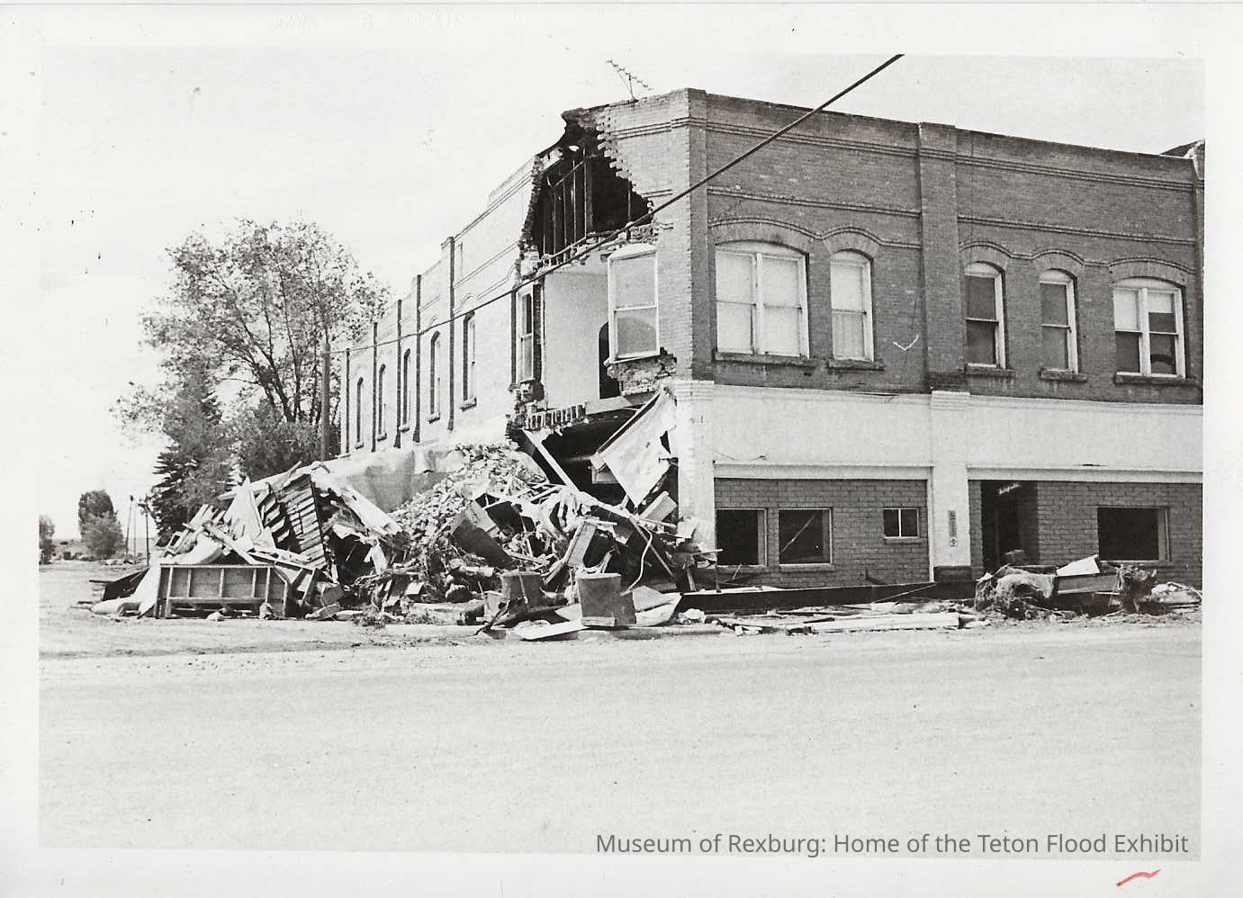 The photo was taken from a brown envelope with "Thanks Dave Gauts" written in cursive. The subject of the photo is a historic building in Sugar City. The building is all made form brick. The left hand side of the building completely collapsed. The original building looks as though it may have been built in a T like shape, but it is unclear due to the destruction the flood caused to it. The dimensions of the photo are 5" X 7". This photo comes from the old Standard Journal Warehouse located at 23 S 1st E.