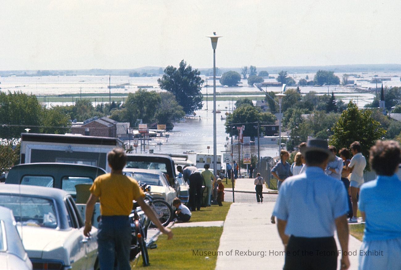 This photo was taken in colour. The subject of the photo is a group of people looking at the water from the Teton Dam. The Foreground shows a group of people standing around. The plot were the MC stands today is to the right of the photographer. The Sign for the Sober Society Pizza can be seen far in the foreground. The Horizon line shows mountains and flooded plains. The photo is a part of a digital collection donated to the museum by Rick Davis.