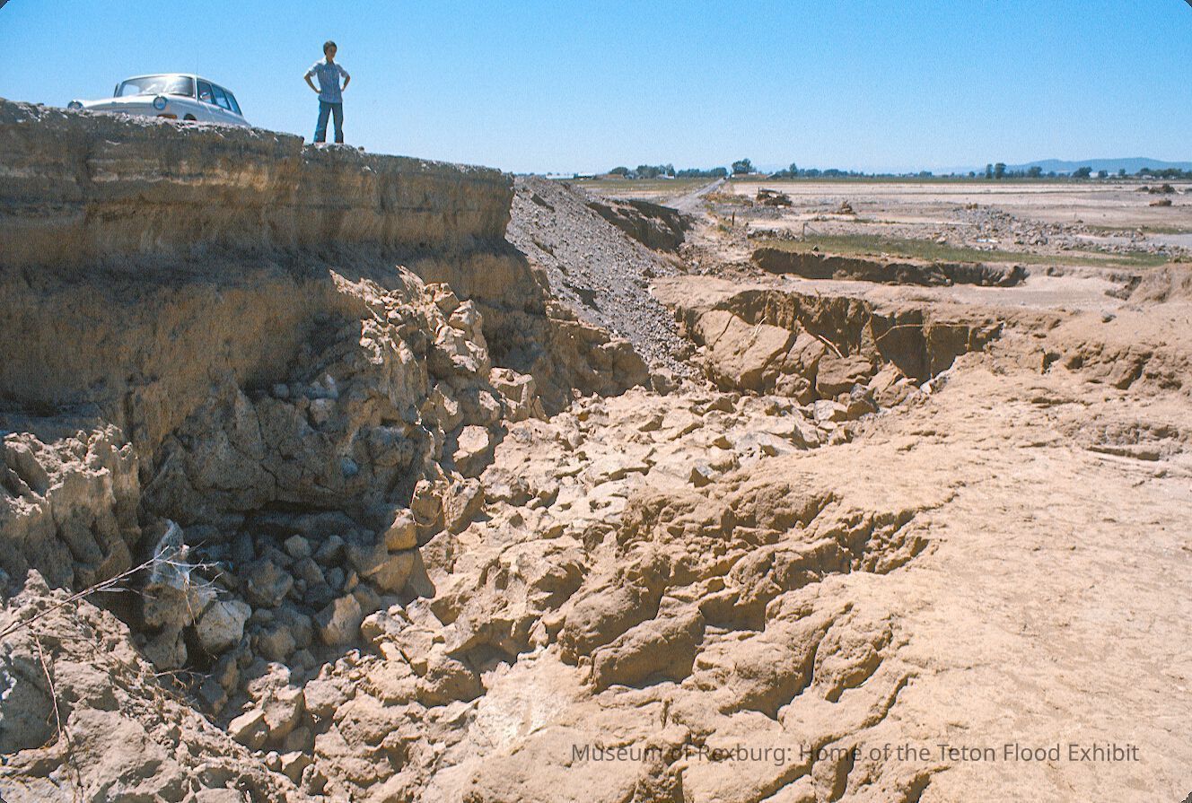 The photo was taken in colour. The subject of the photo is a road in Wilford that completely collapsed due to the wide devastation of the uncaring flood. The road was reduced to rubble and ruin. In the shot there is a person with hands on their waist looking over the fallen roads. Their white car is parked right behind them. The photo is a part of a digital collection donated to the museum by Rick Davis.