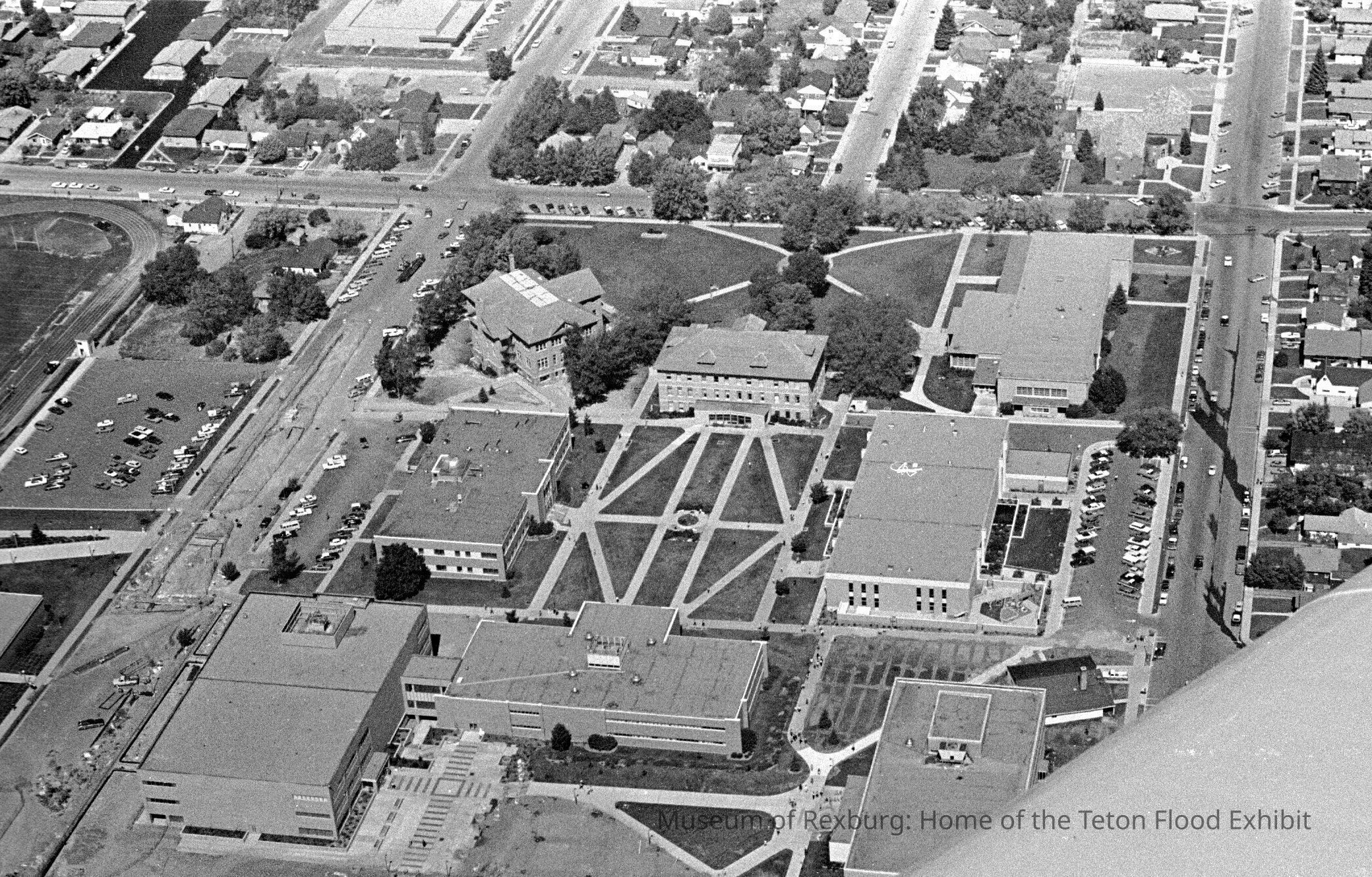 The photo was taken in black and white. The subject of the photo is Ricks College campus in 1976. The Campus is much smaller compared to the BYU-I campus today. The shot contains the Hart building, the Manwaring Center, The Romney building, The Gymnasium, and other buildings. The aerial shot also has a portion of the Rexburg area near the campus. The bottom right corner of the photo has a portion of the plane or helicopter that the photo was taken from. The photo is a part of a digital collection donated to the museum by Rick Davis.