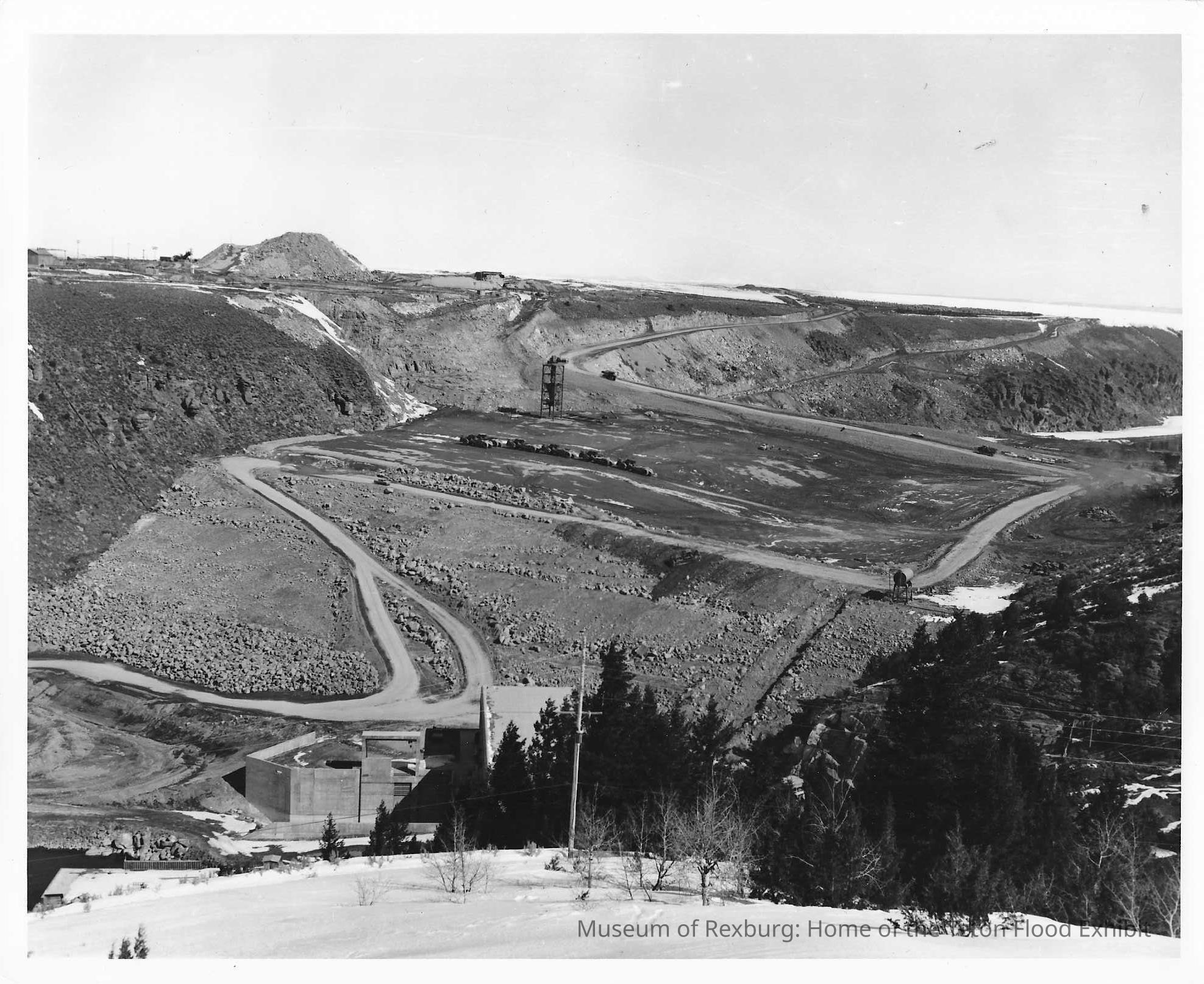 E) Label on back of photo reads: P549-147-5480 NA Teton Dam, Teton Project, Idaho. A general view of dam embankment from the visitor outlook point on the downstream left abutment. Trench in the lower right of the photo on the downstream dam embankment is for duct bank. Riprap stockpile is located in the lower left of the photo. Morrison-Knudson Company, Inc. and Peter Kiewit Sons' C. This photo 8 x 10 inches and is black and white. In this photo we can see multiple dirt roads crisscrossing this photo.