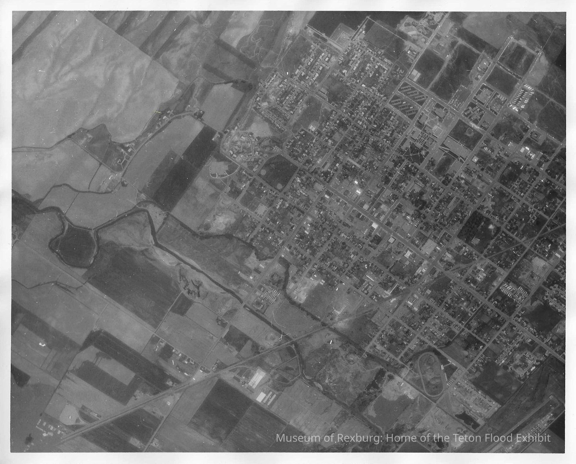 This photo is an 8x10 black and white aerial photo. On the back it says BONES STALL AC929 5 Jun76 1820T KA56 Rexburg and Ricks ID in red marker. The photo is from very high up and shows the Rexburg and Ricks area and on the left of the photo are more fields.