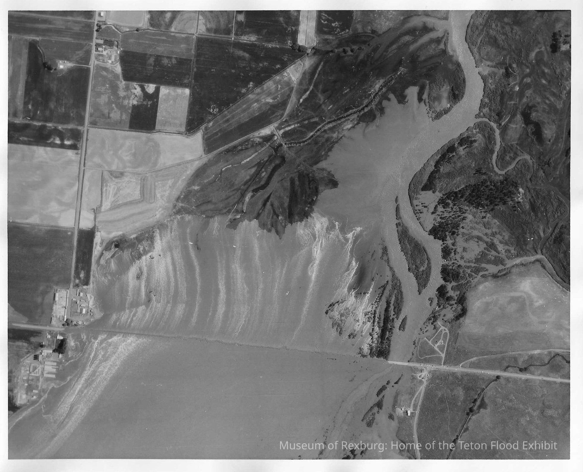 This photo is a black and white 8x10 print that has a white border around the area photographed. The words Town/Petro A/C 902 5 June 76, 1645 T W of Rexburg, Idaho are written in red marker on the left top corner. This photo shows the dam and surrounding area after the dam had breached. You can see the flood going over the road.