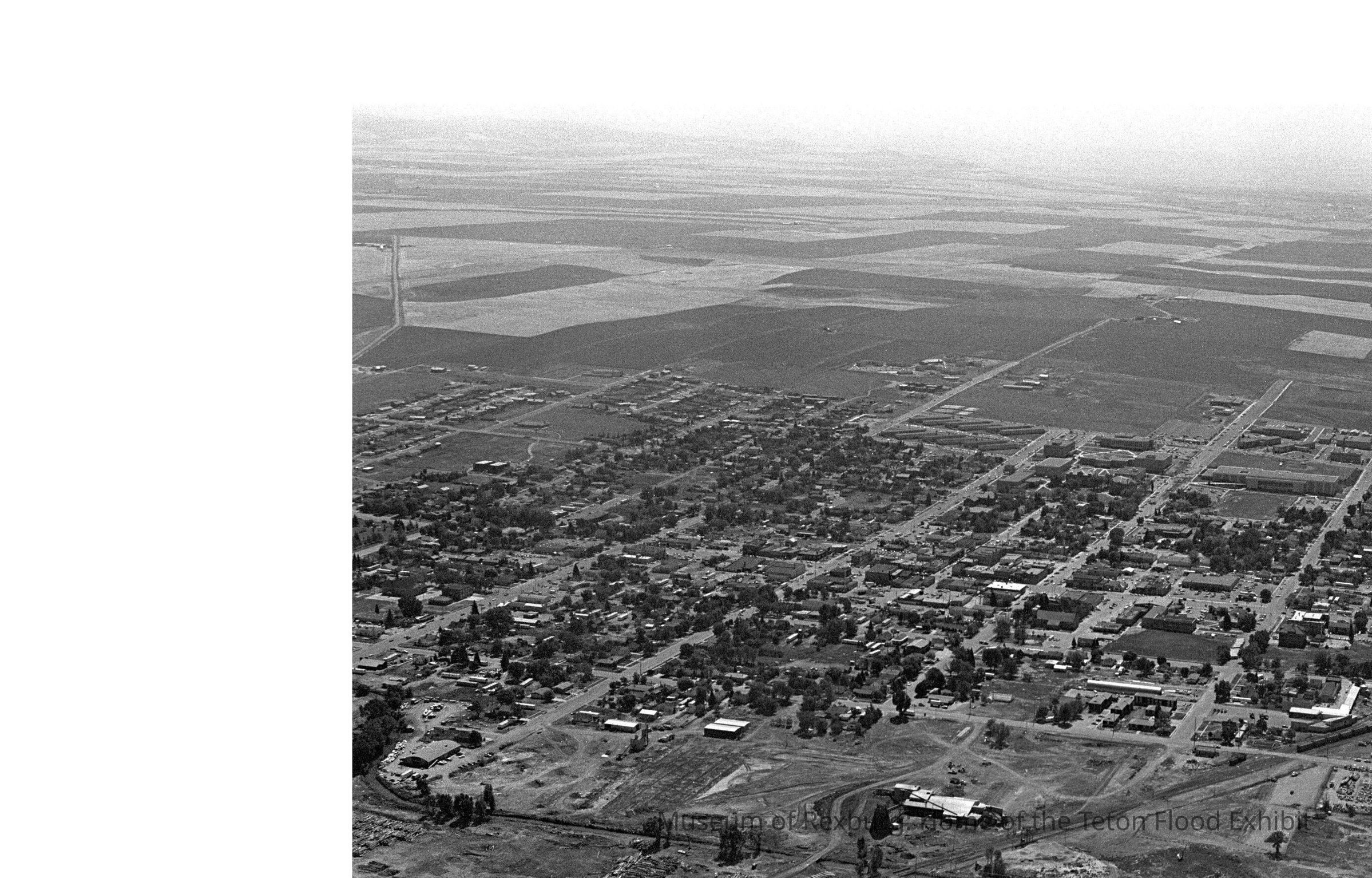 This photo was taken in Black and white. The subject of the photo is an aerial shot of Rexburg. According to Rick Davis it is a shot looking South East across Rexburg. The shot includes most if not the entirety of the town and many of the farmlands outside. It seems this photo was taken before the flood waters hit Rexburg. The photo is a part of a digital collection donated to the museum by Rick Davis.