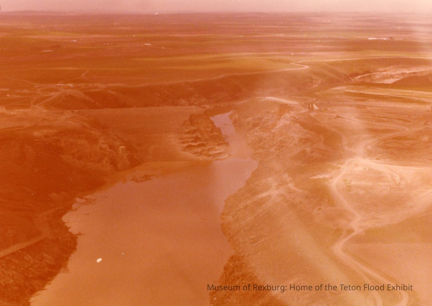 This Photo is in color but is extremely over-exposed or faded. This photo has rounded corners. This photo is 3.5 x 5 inches big. This photo came with 23 other photos. This photo was donated by Verl Soderquist. He was going through his father's photos and found them. His father lived in Teretan, Idaho. The photo was ran through a cleaning program and he added comments about what he speculated in the photo. Those photos can be found the Museum's Terabyte external storage drives. We can see the Dam in this photo. The view that this photo was taken was looking down the canyon at the Teton Dam Site after the majority of the water had left.