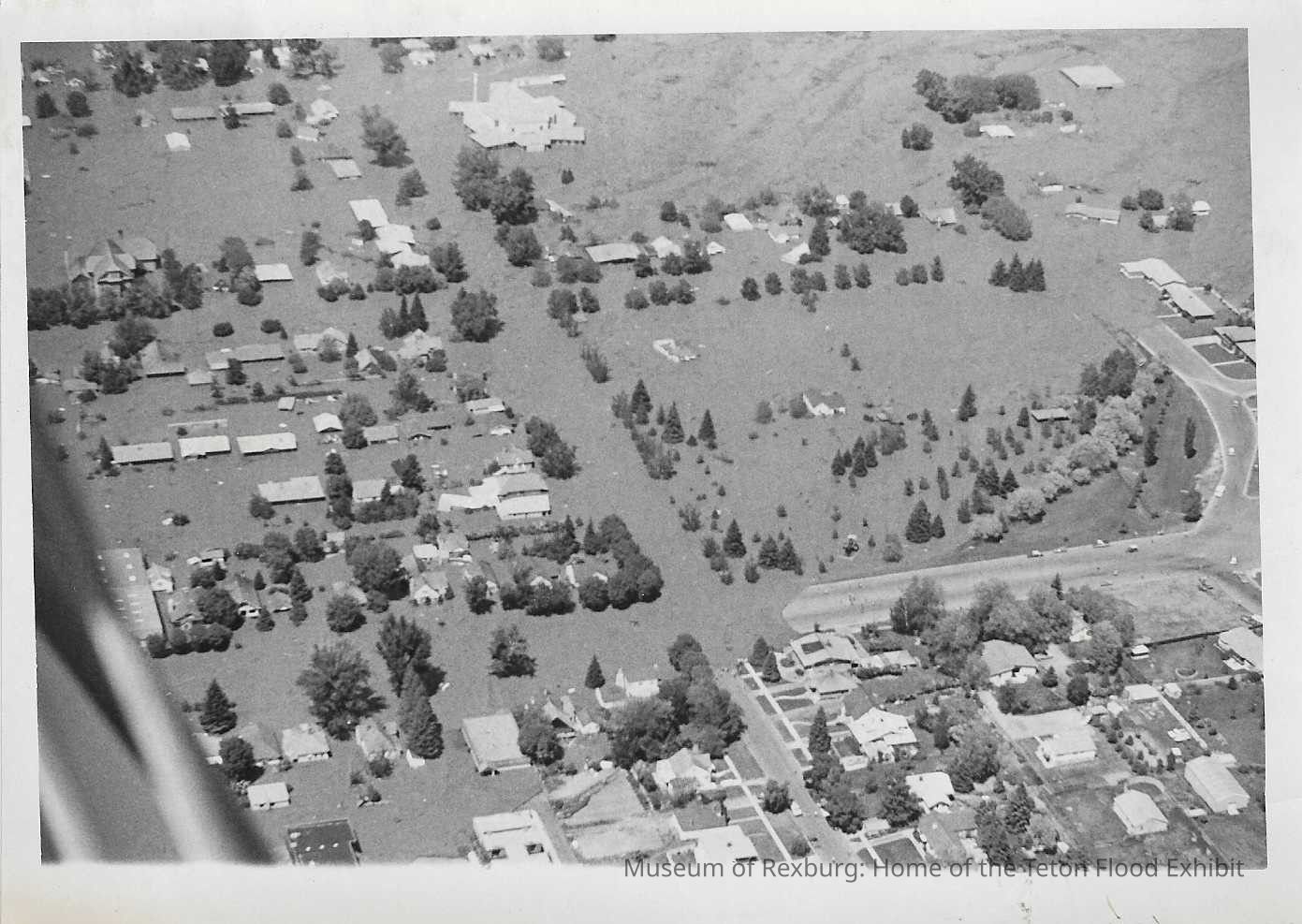 This photo is black and white and shows how the flood waters moved through a town/city. This photo was taken from the sky because we can also see part of a plane or helicopter to the bottom left of the photo. On the back of the photo it reads, "Wide 3 - col 125%". This photo is 5 x 7 inches big. This photo comes from the old Standard Journal Warehouse located at 23 S 1st E.