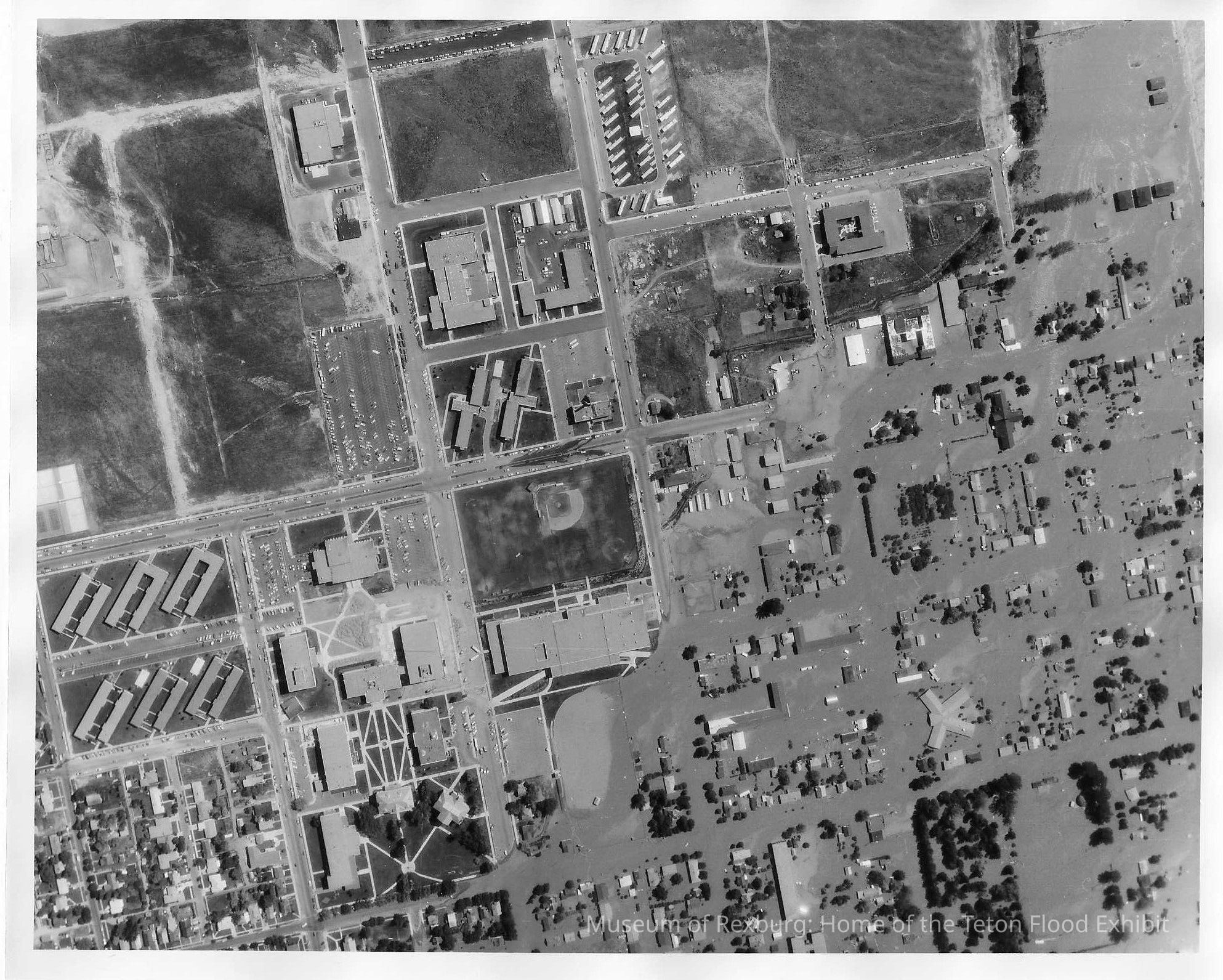 This photo is 8x10 black and white. On the back it says Town/Petro A/C 902 5 June 76, 1645 T KS 87 Rexburg, Idaho in blue marker. The lower right half diagonal is the flooded area, and then the top left is not flooded. It shows lots of buildings and some fields.