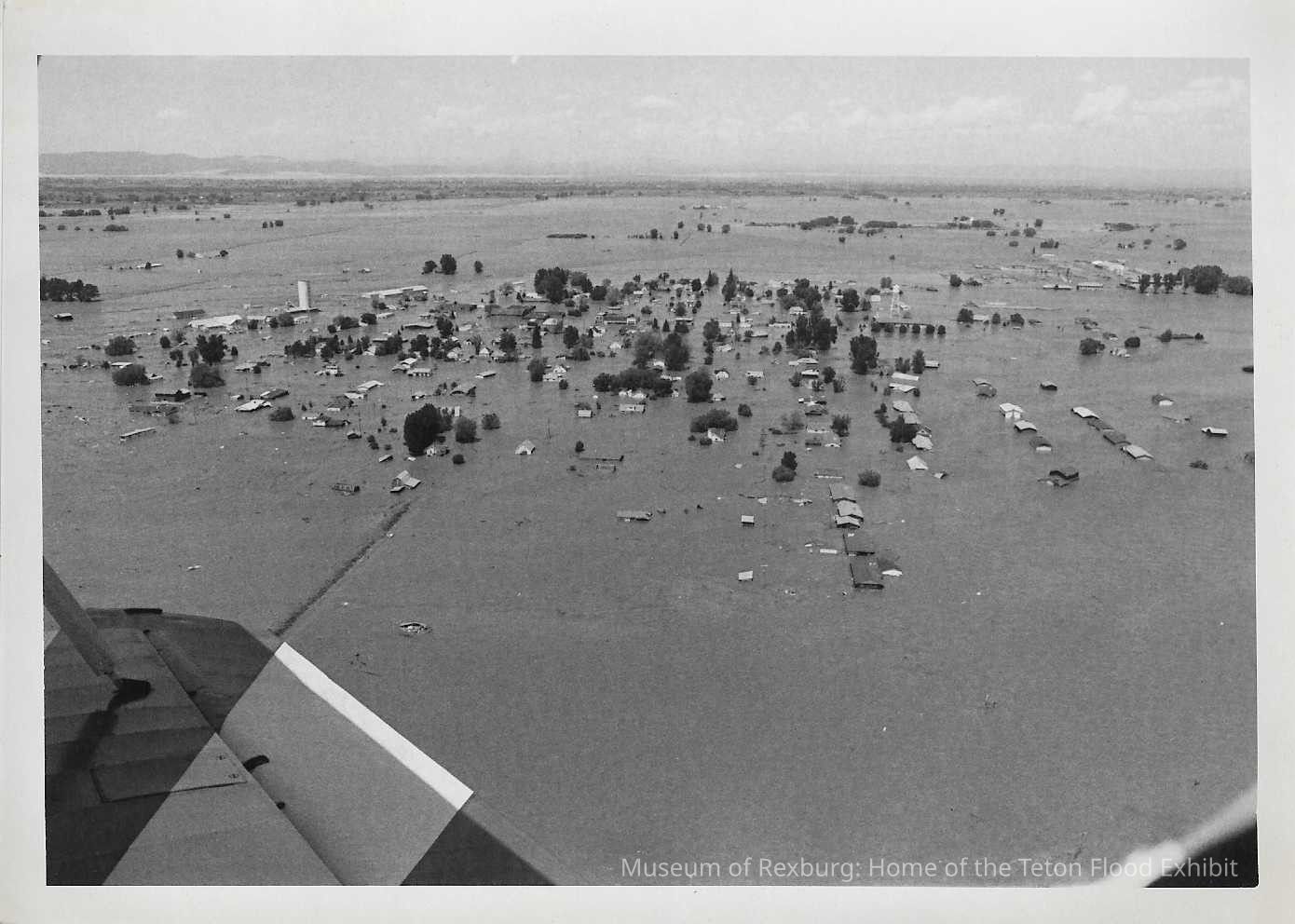 This photo is black and white and shows an aerial view of Sugar City. We can see how all the buildings in this photo have been totally flooded by the Teton Dam Disaster. We can see that this photo was taken from an airplane because we can see part of the plane to the bottom left hand corner of this photo. This photo is 5 x 7 inches big. This photo comes from the old Standard Journal Warehouse located at 23 S 1st E.