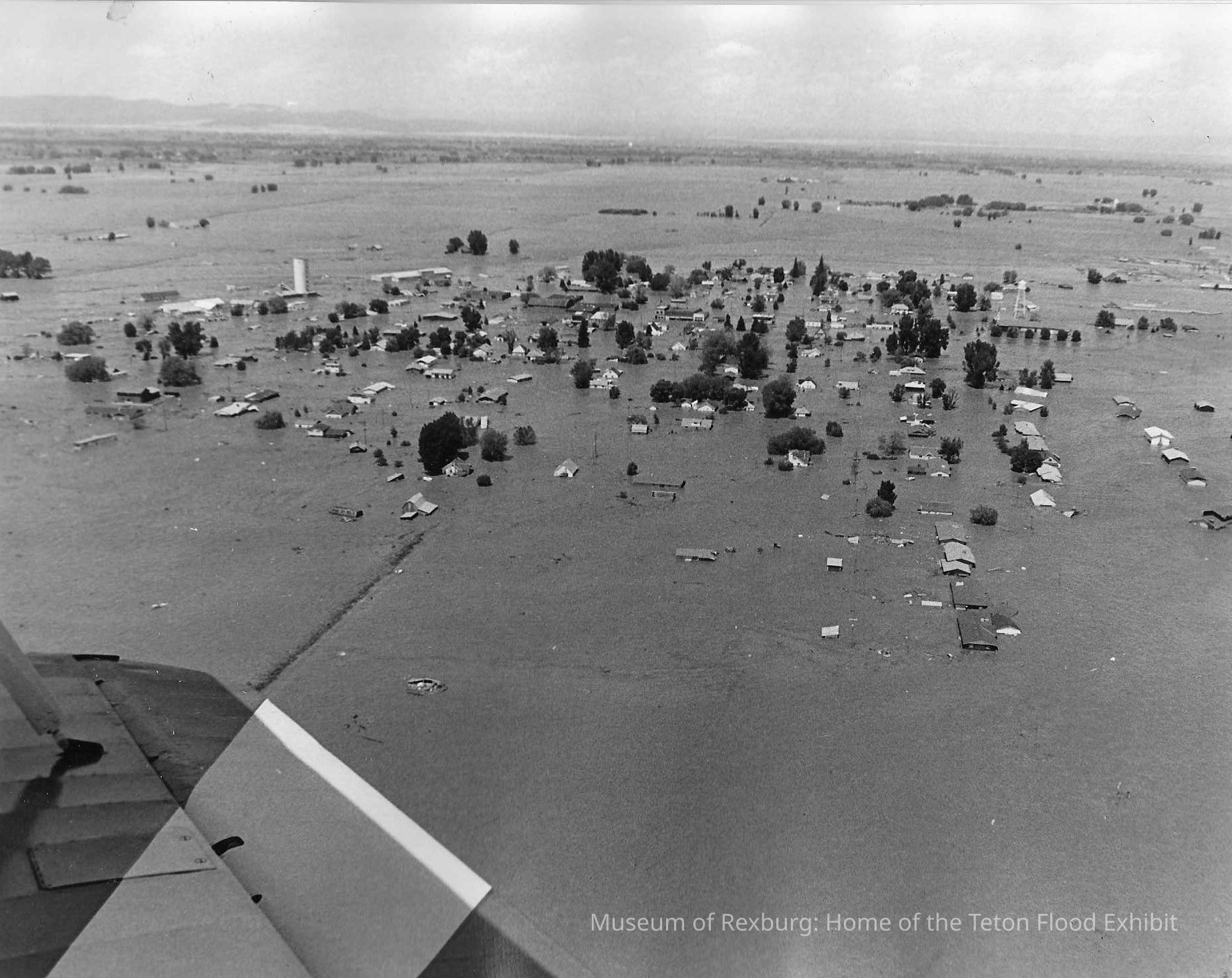 This photo is black and white and shows Sugar City during the flood. The entire town is full of water. This photo was taken from the air from a plane. We can see the plane's wing in the lower left hand corner of the photo. In the background of the photo we can see the sand dunes. This photo is 7.5 x 9.5 inches big. This photo comes from the old Standard Journal Warehouse located at 23 S 1st E.