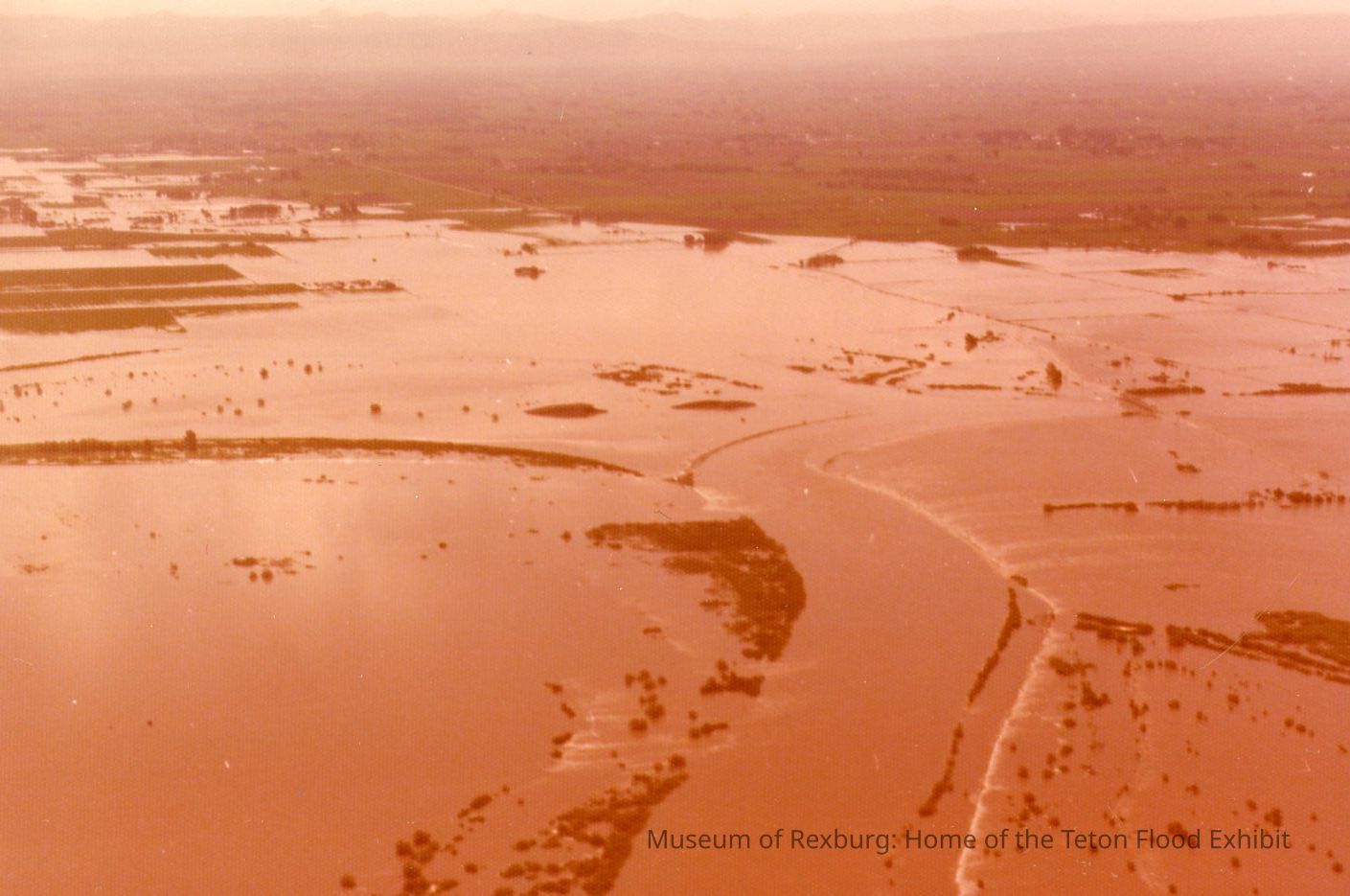 This Photo is in color but is extremely over-exposed or faded. This photo has rounded corners. This photo is 3.5 x 5 inches big. This photo came with 23 other photos. This photo was donated by Verl Soderquist. He was going through his father's photos and found them. His father lived in Teretan, Idaho. The photo was ran through a cleaning program and he added comments about what he speculated in the photo. Those photos can be found the Museum's Terabyte external storage drives. This photo shows an overflowed riverbed. We can also see the floodwaters headed towards a town/city in the distance.