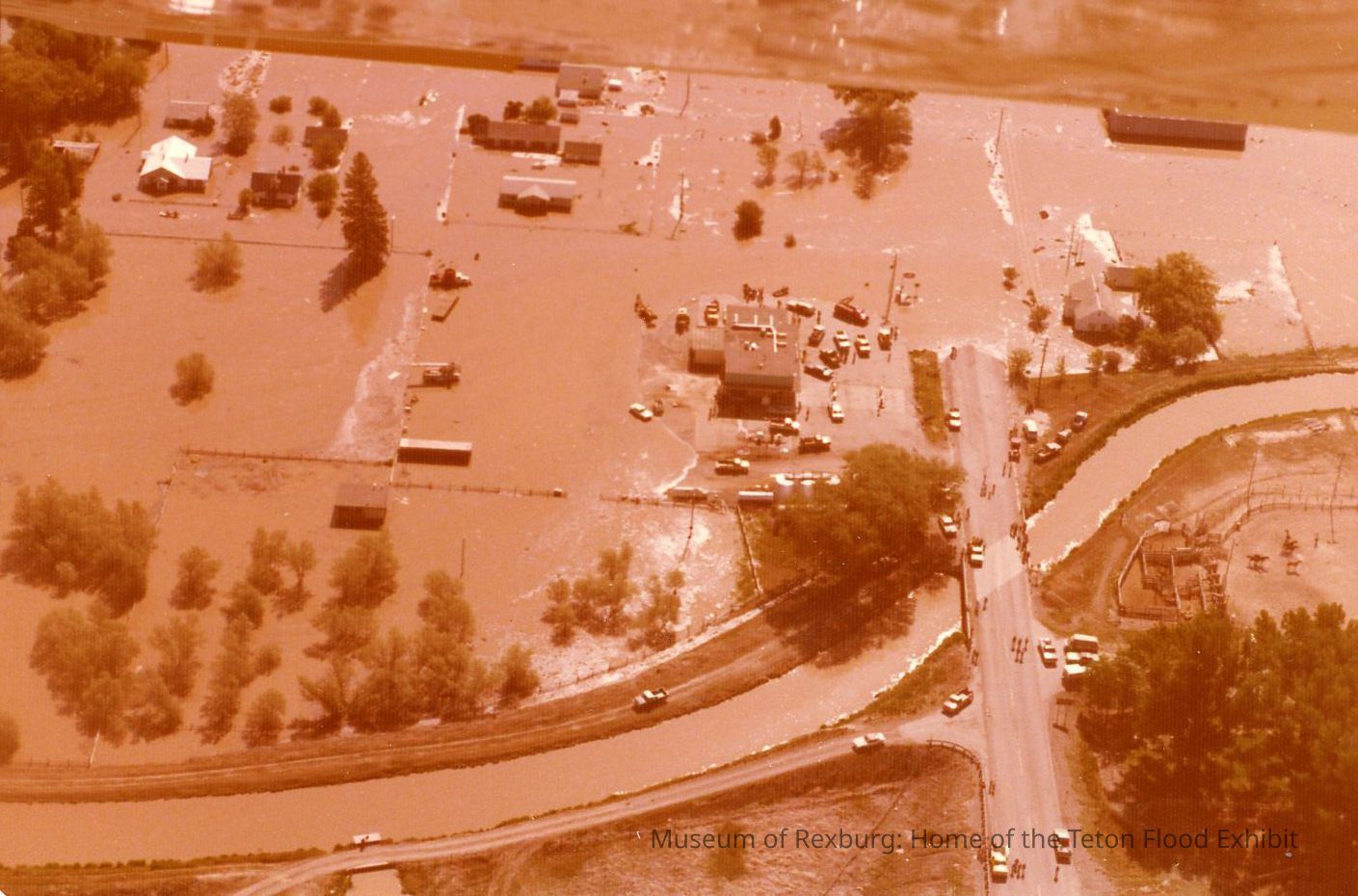 This Photo is in color but is extremely over-exposed or faded. This photo has rounded corners. This photo is 3.5 x 5 inches big. This photo came with 23 other photos. This photo was donated by Verl Soderquist. He was going through his father's photos and found them. His father lived in Teretan, Idaho. The photo was ran through a cleaning program and he added comments about what he speculated in the photo. Those photos can be found the Museum's Terabyte external storage drives. This photo shows a road with a few people standing and a few cars escaping from the flood waters.