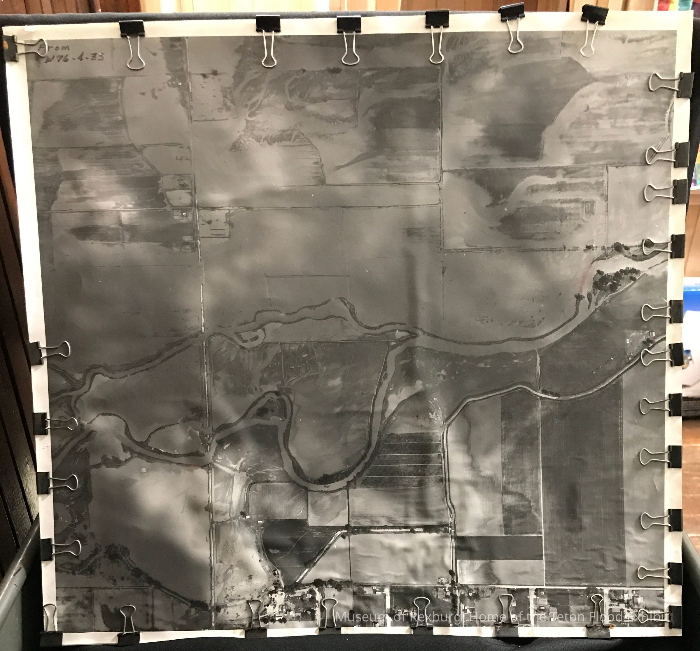 This photo is 28.25x28 inches and is a black and white aerial shot of the flood. There is small writing on the upper left hand corner that reads, "From W76-4-33. There are black clips lining all of the edges.