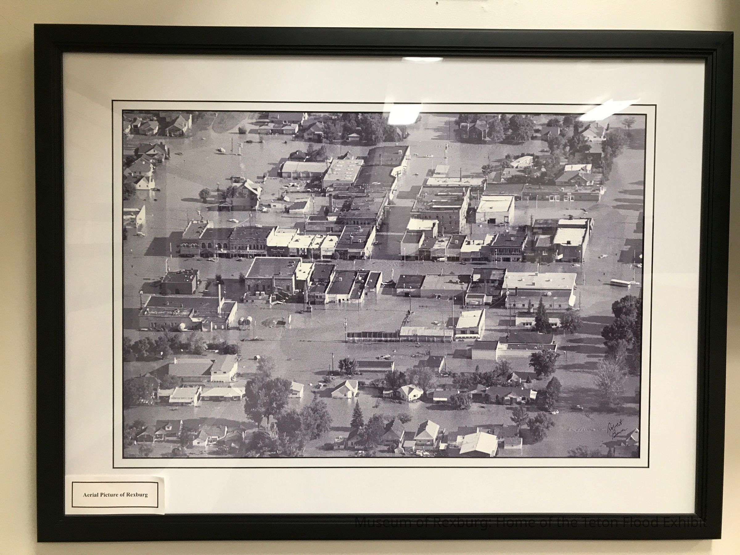 This photo is black and white and shows the main street of Rexburg sometime after the flood. There is flooded buildings and cars pictured. The photos shows many of the businesses that were on main street at the time. The businesses shown are the ones on the south side of the street. The name Robert Bower is written in the right bottom corner. The photo is on a white mat. There is a sliver tag on the bottom right on the back that says it was done by the Framing shop. This photo is 27.5 x 37 inches big.